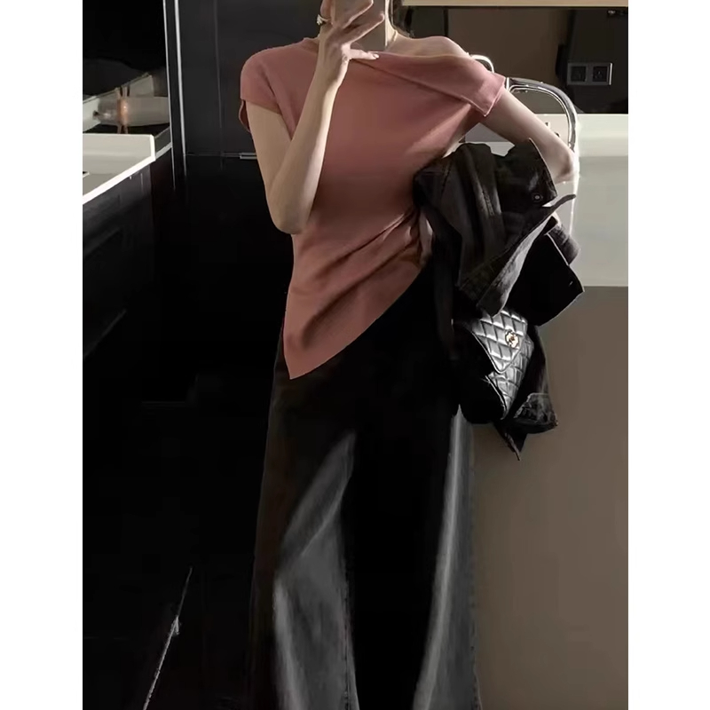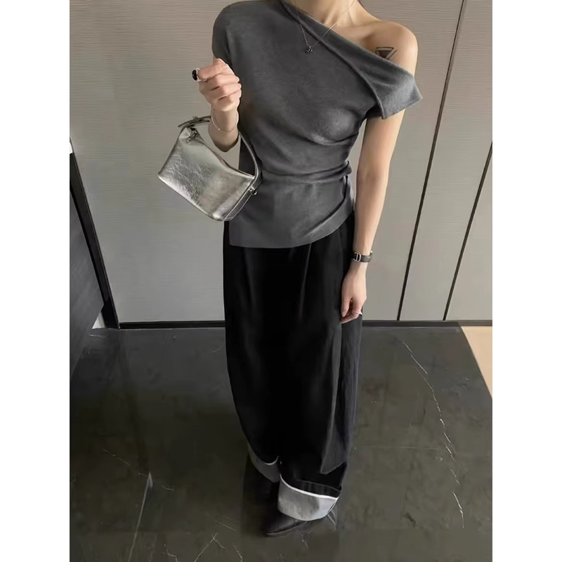 设计感小众修身 法式 新款 女夏季 显瘦露肩上衣 斜肩不规则冰丝针织衫