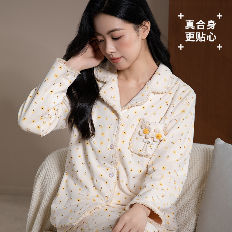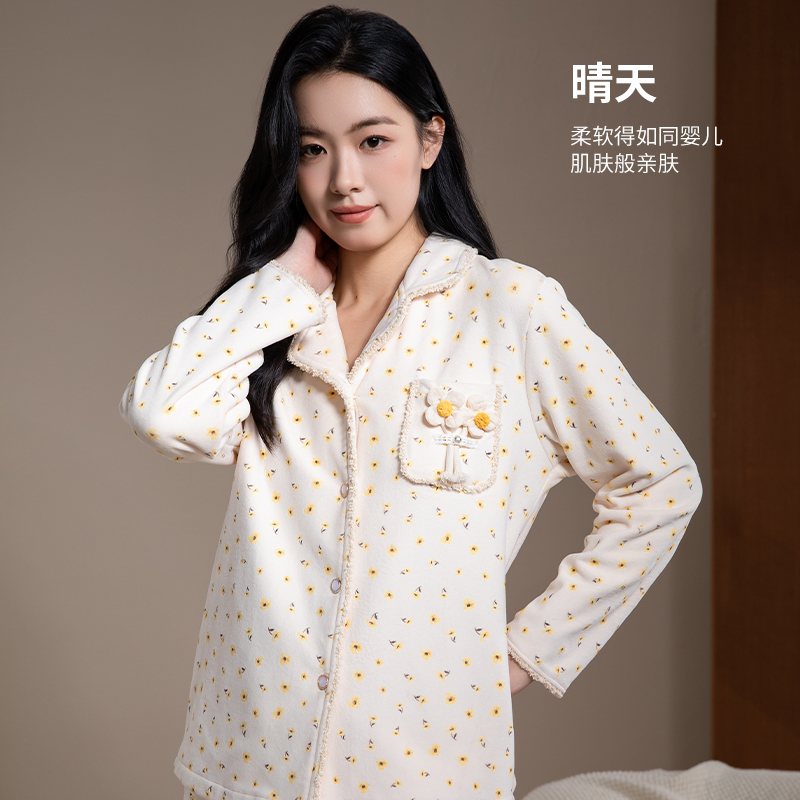 法兰绒家居服套装 睡衣女秋冬季 三层加厚珊瑚绒夹棉袄加绒保暖新款
