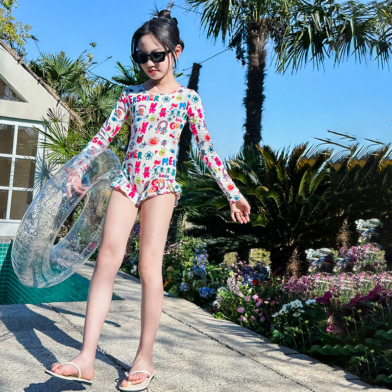 多巴胺网红儿童防晒长袖 大童连体泳装 夏季 女童泳衣高级感2025新款