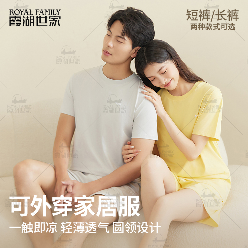 霞湖世家情侣睡衣5A抑菌防螨舒适圆领短袖 男女Y026 家居服套装