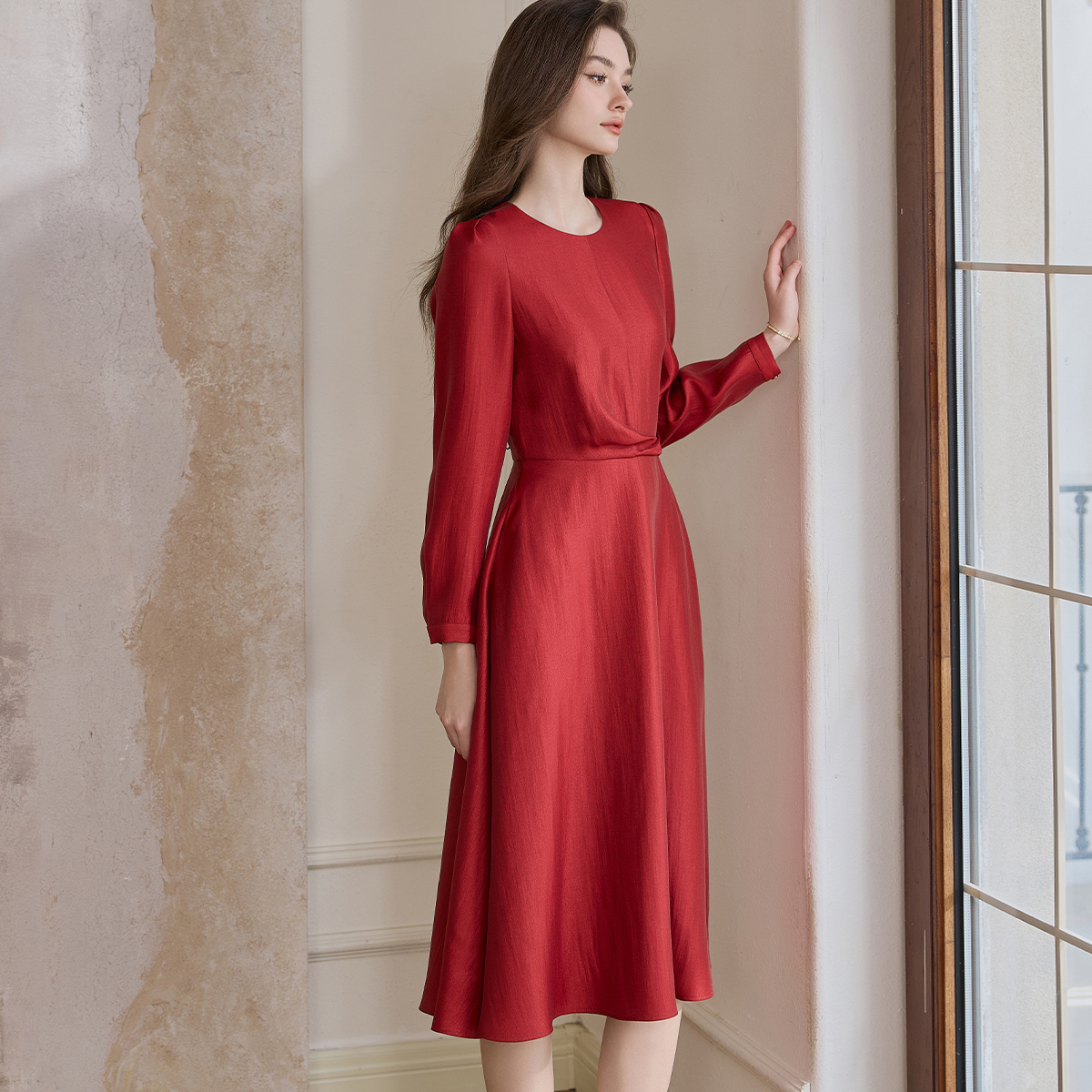 罗衣高级亮丝收腰连衣裙女2025秋季 气质安可拉红大摆裙11683 新款
