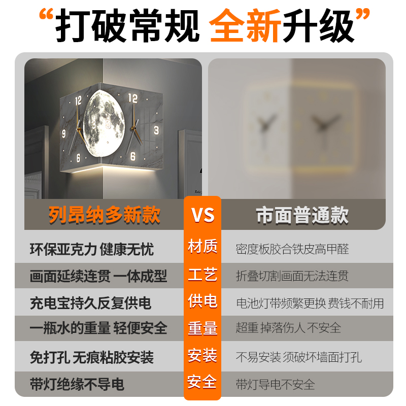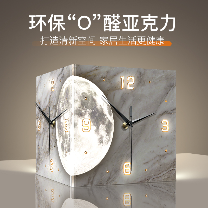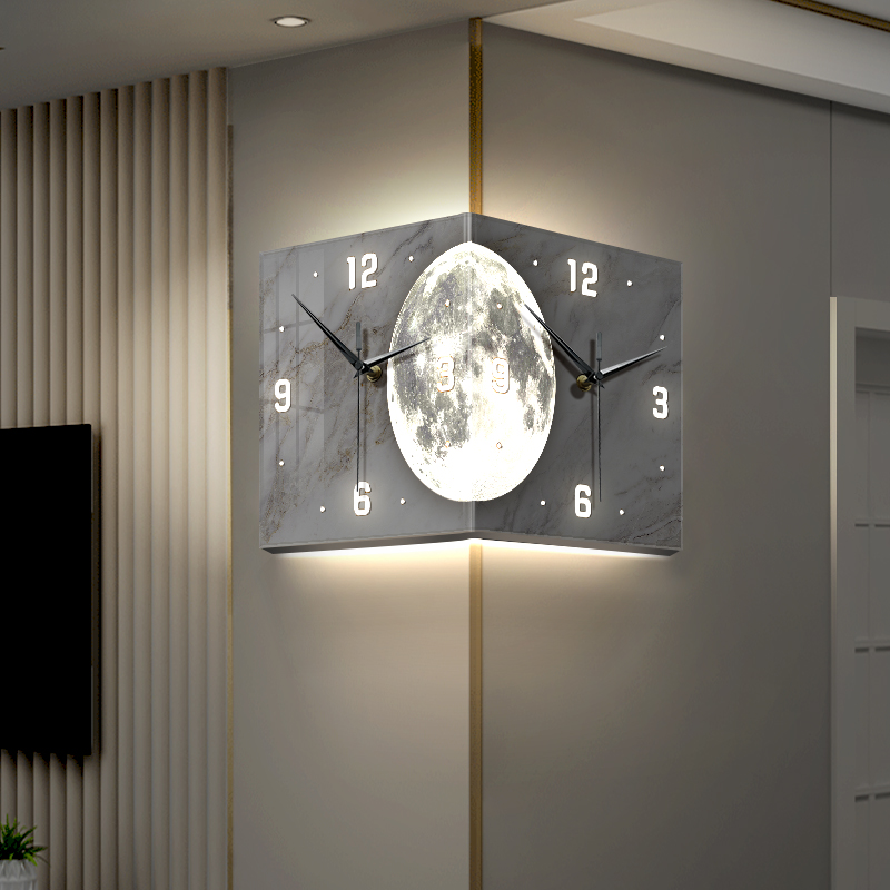 2025新款 客厅拐角双面发光创意时钟壁灯月球阳角挂钟免打孔转角钟