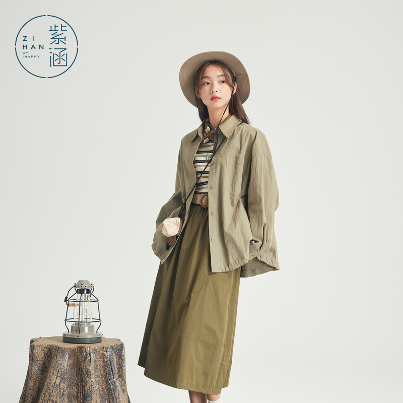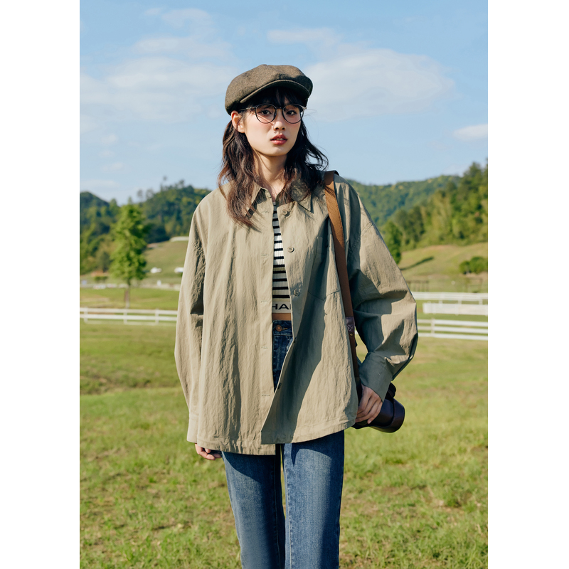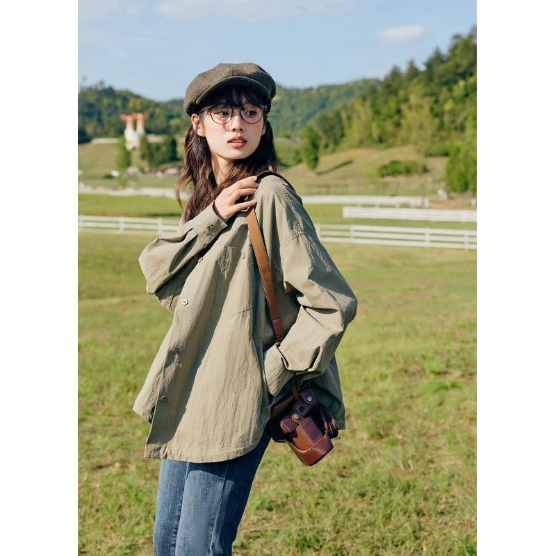 新款 短外套女春秋季 森系小个子宽松慵懒休闲上衣 衬衫 紫涵绿色长袖