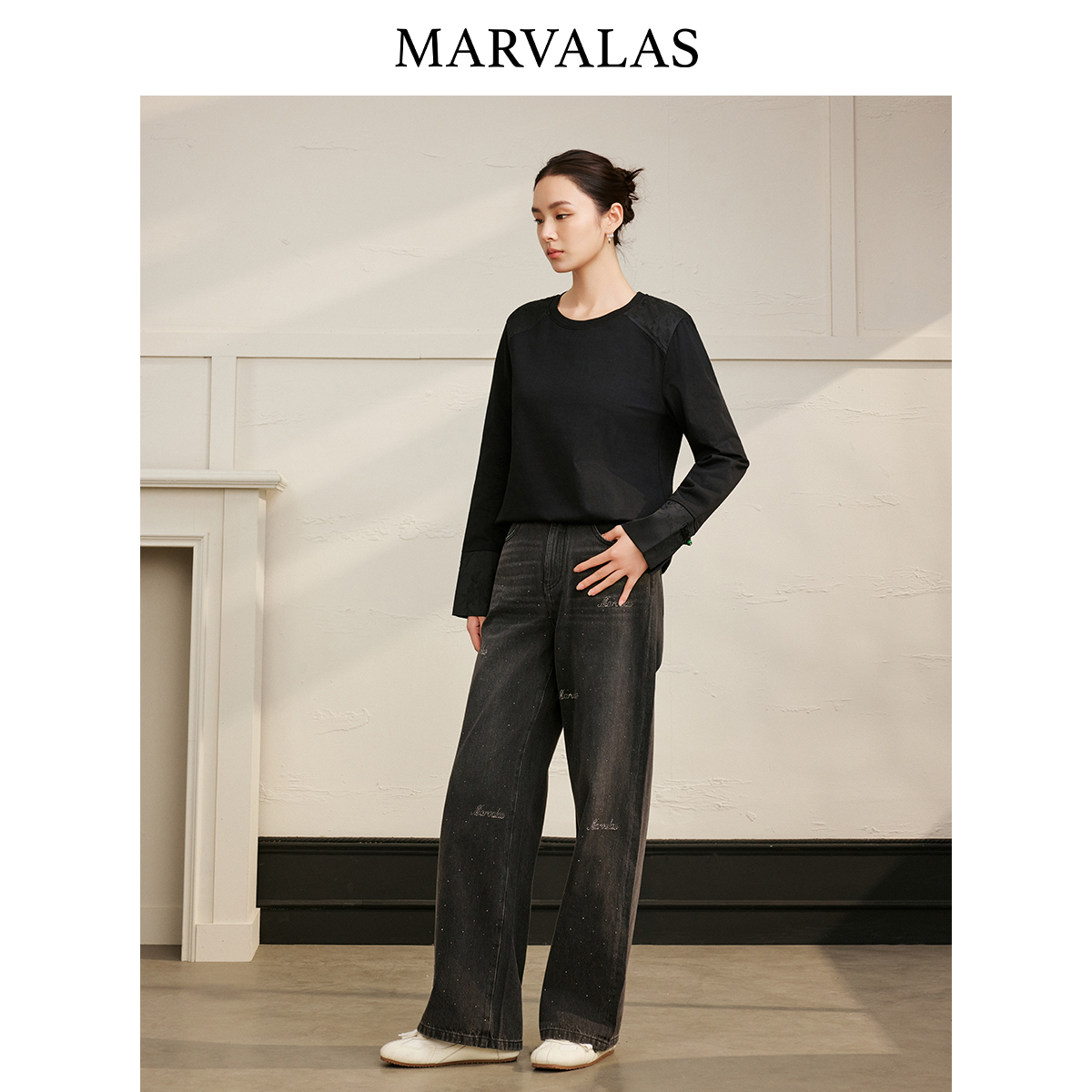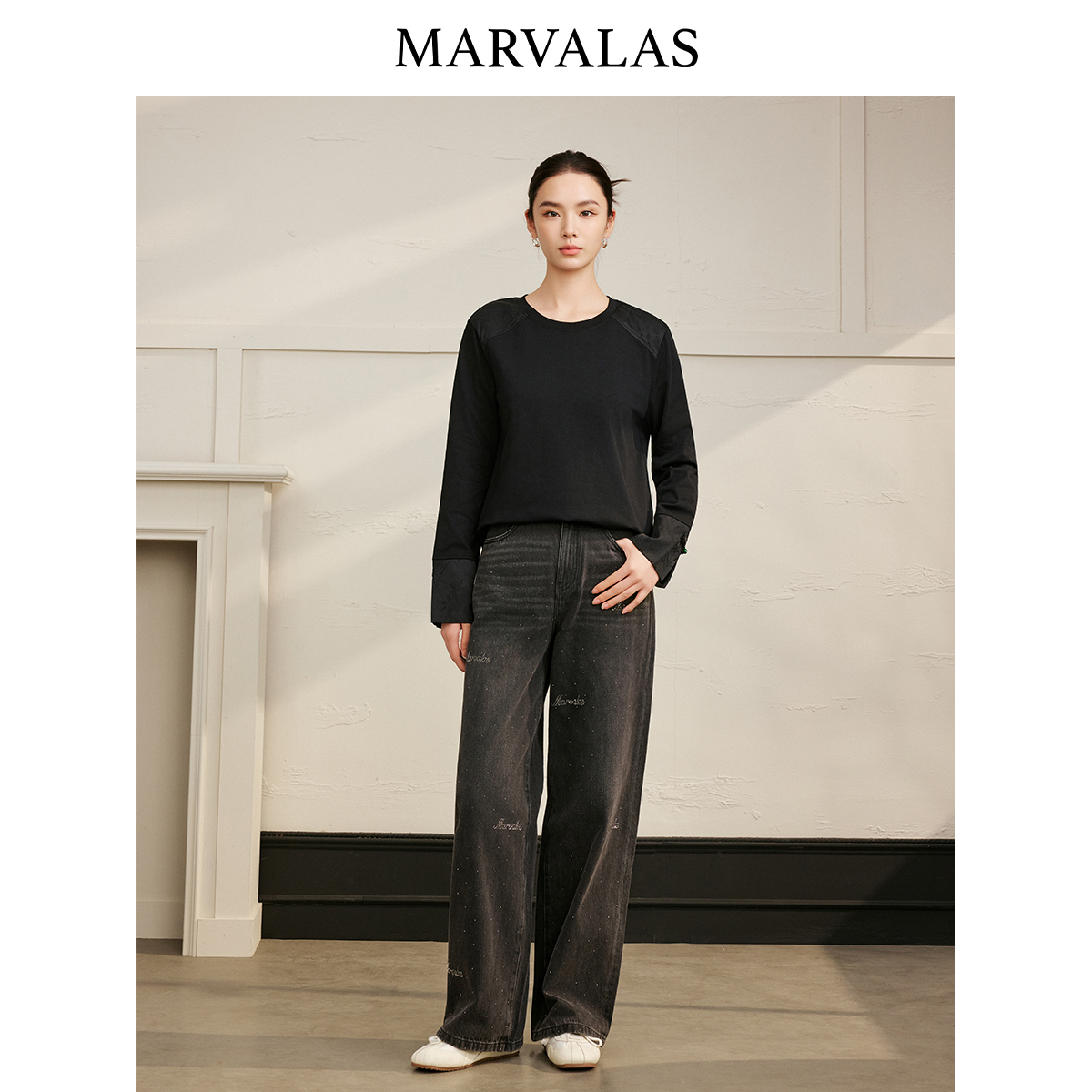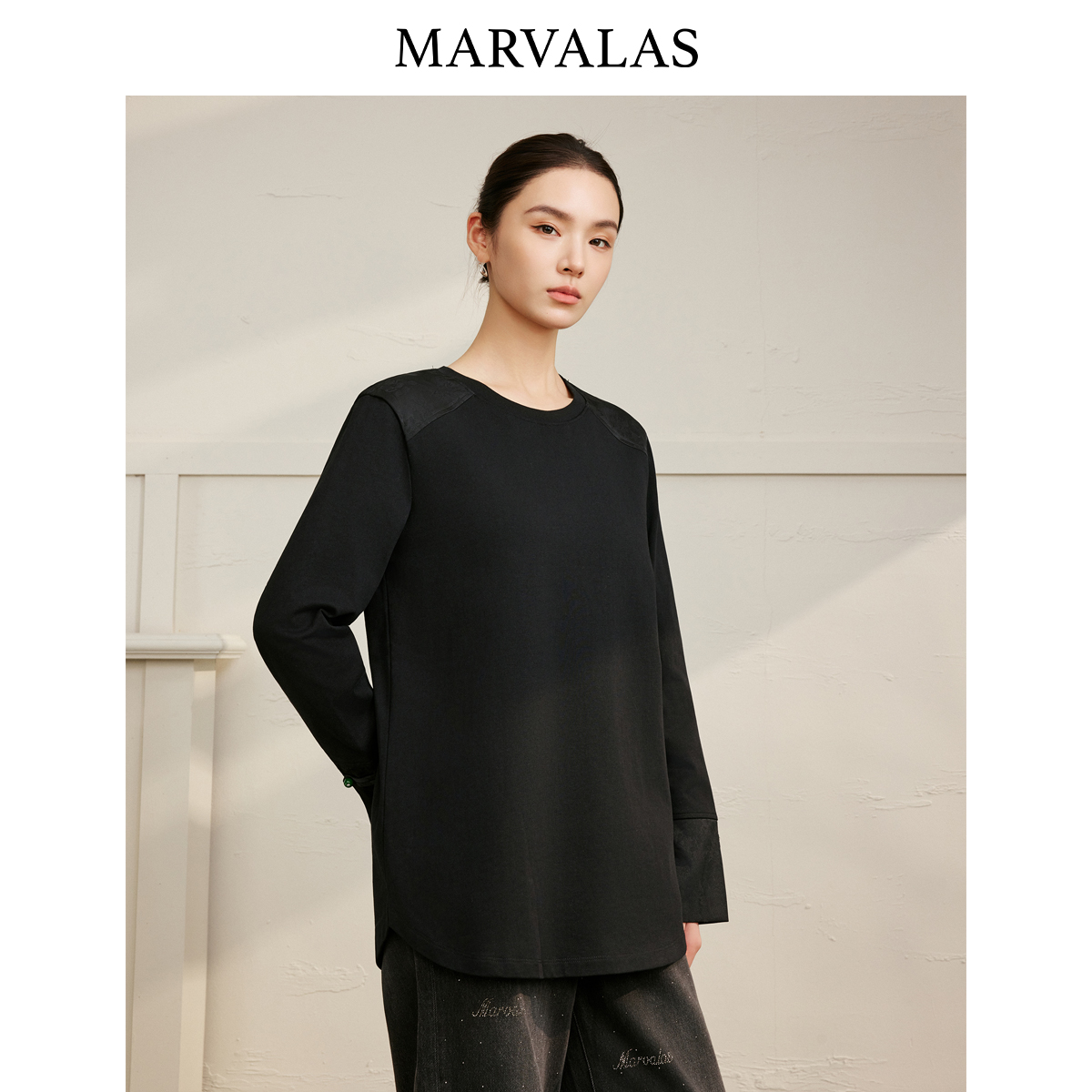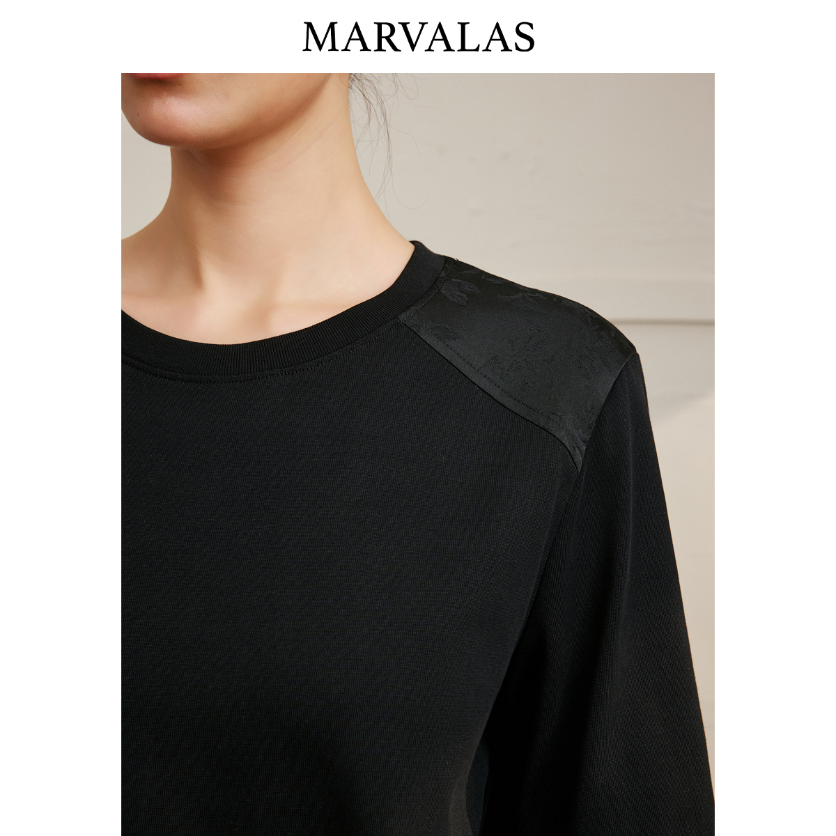通勤上衣 国风暗纹提花拼接设计长袖 曼德诗100%棉T恤2025秋季 新款
