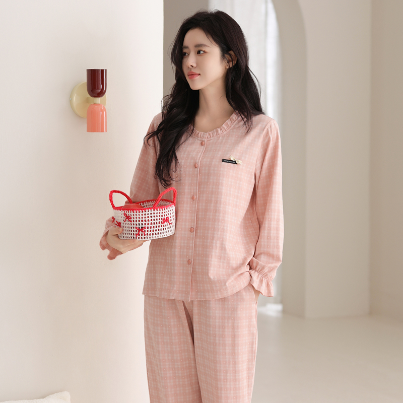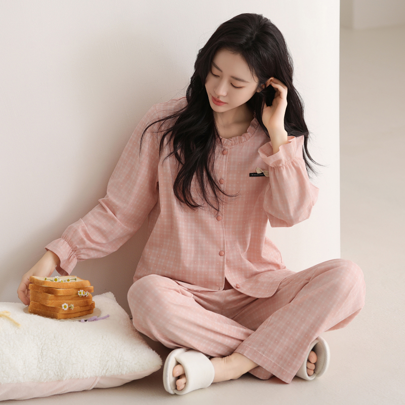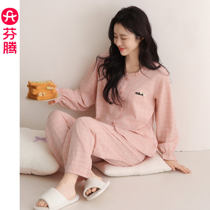 口秋季 芬腾睡衣女春秋款 荷叶袖 花边圆领开衫 可外穿家居服 纯棉长袖