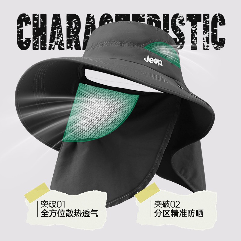 Jeep遮阳帽男款 户外登山钓鱼防紫外线太阳帽女披肩护颈渔夫帽 夏季