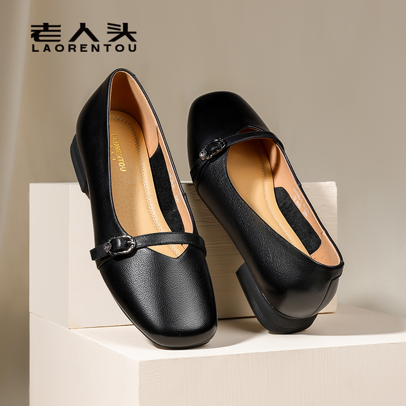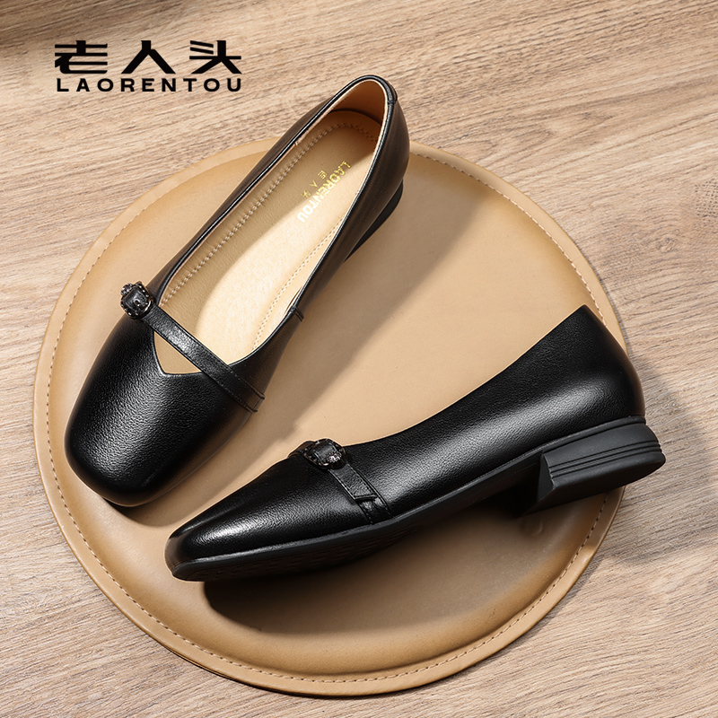 舒适百搭粗跟奶奶鞋 女平底方头中跟小皮鞋 单鞋 老人头2025春夏新款