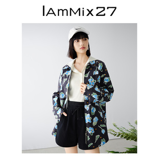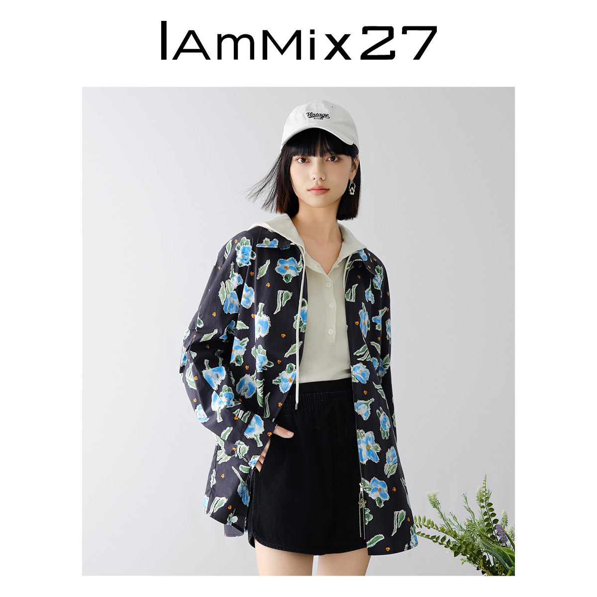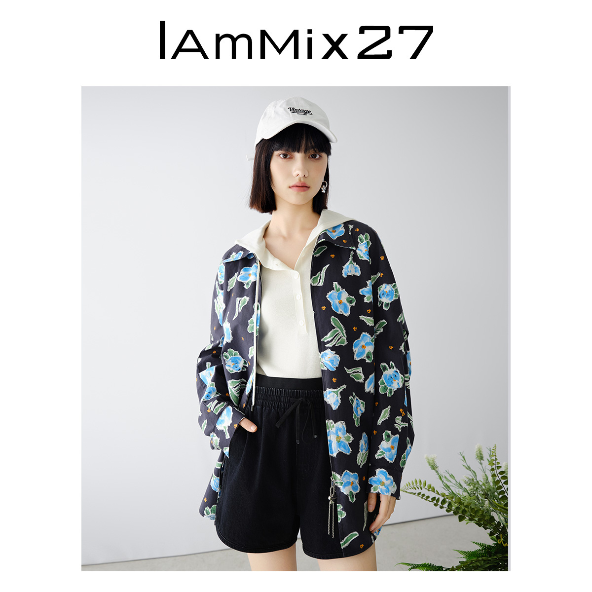 IAmMIX27春秋休闲衬衫 宽松大廓型天蓝纯棉印花落肩衬衣外套 女长袖