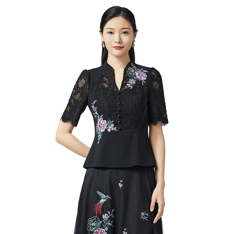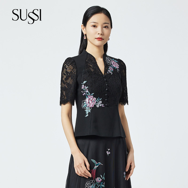 上衣女 黑色V领收腰显瘦百搭刺绣烫钻短袖 SUSSI 古色24夏商场同款