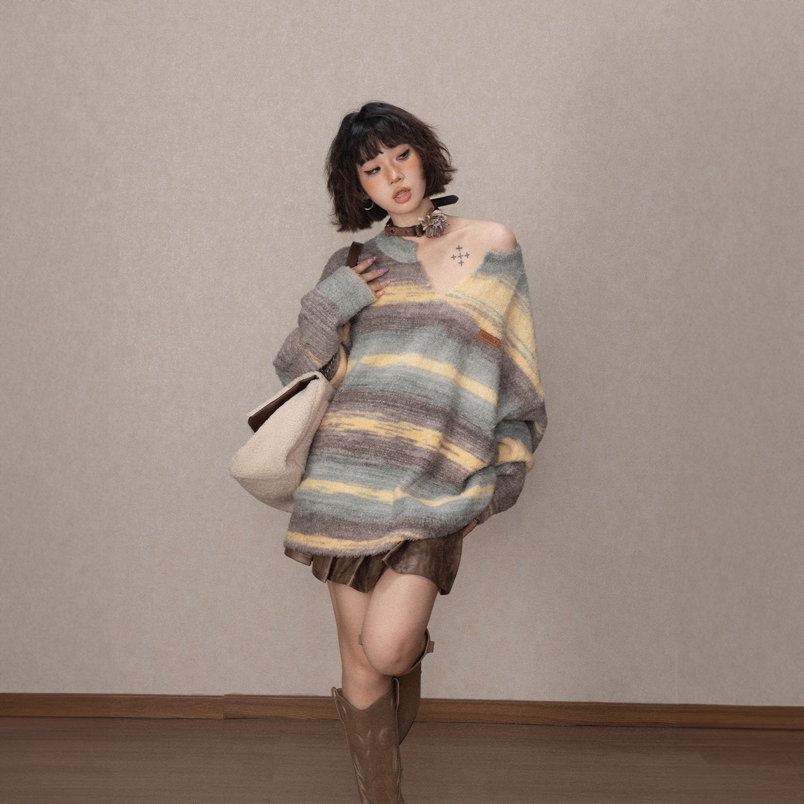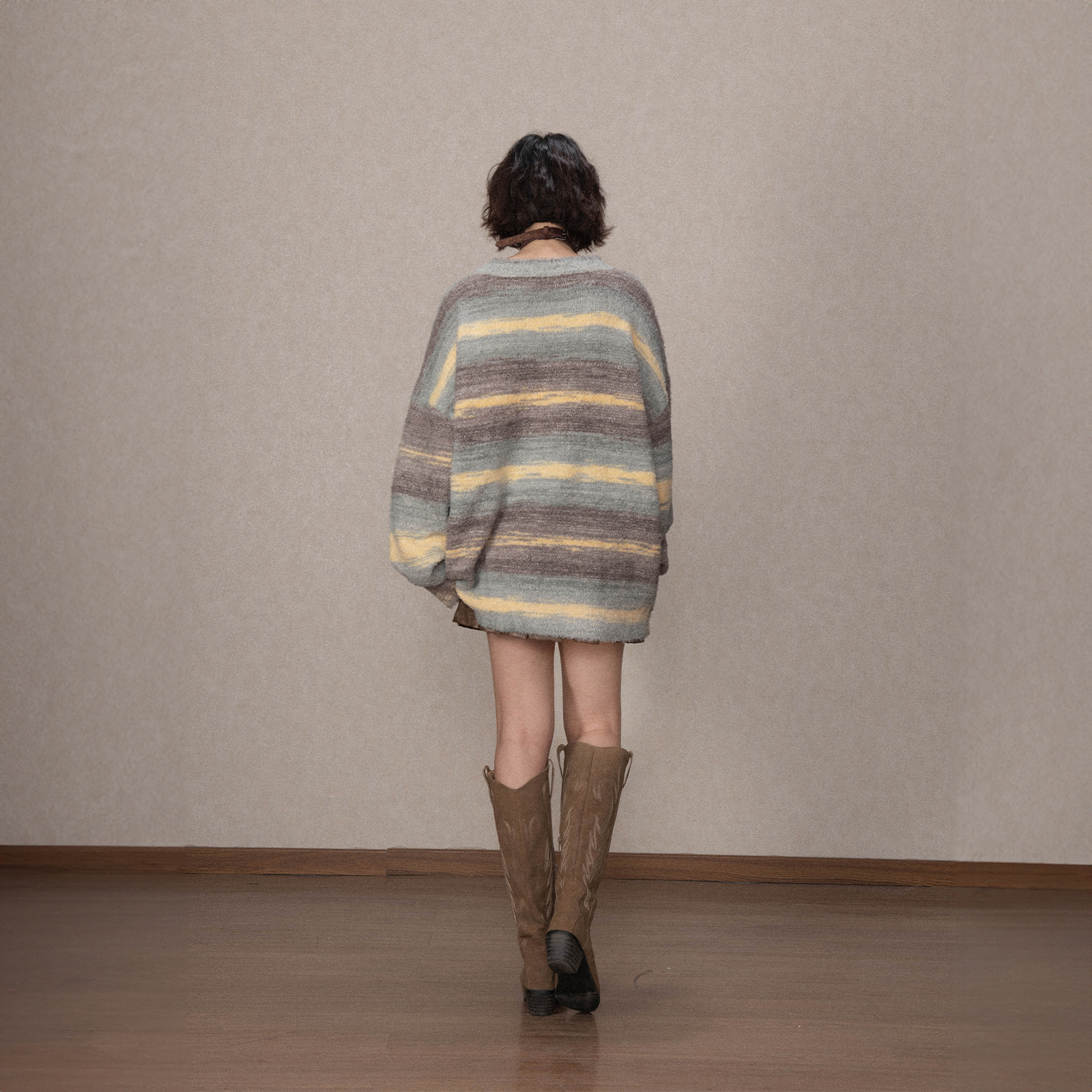 宽松百搭减龄显瘦简约风毛衣上衣 新款 蓝色条纹围脖针织开衫 女秋季