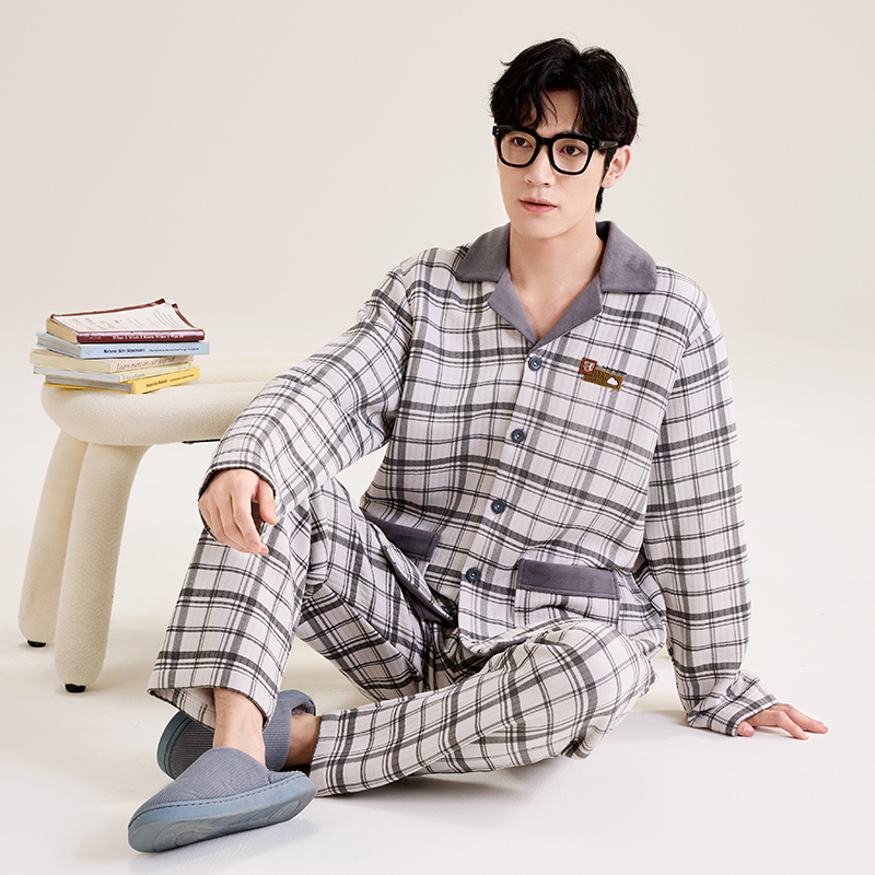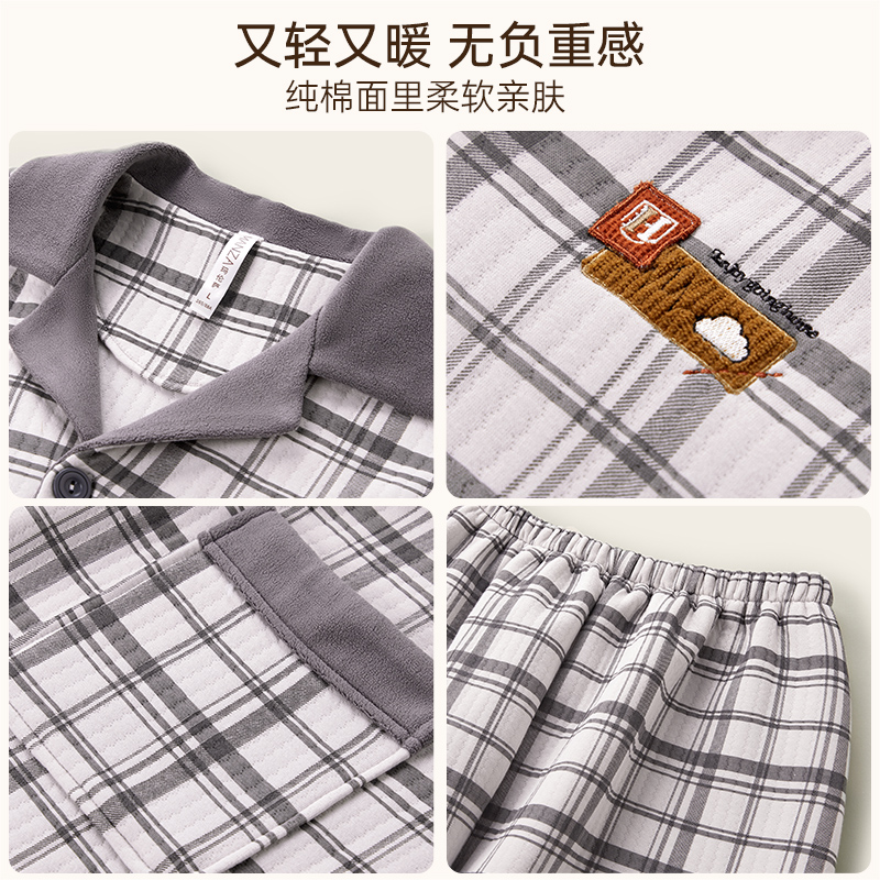 格纹家居服套装 夹棉保暖2024纯棉秋冬季 睡衣空气棉薄款 玛伦萨男士