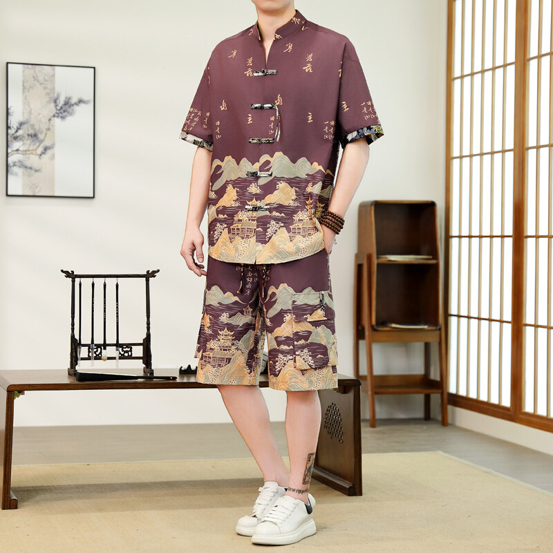 薄复古冰丝短袖 两件套夏季 t恤男士 新中式 中国风男装 汉服套装 唐装