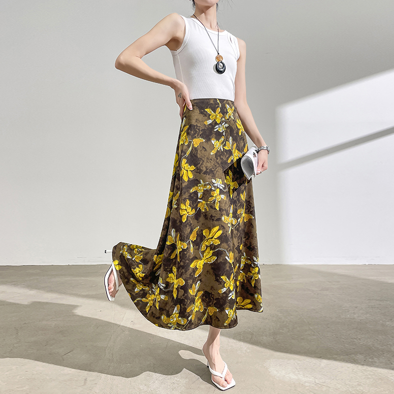 碎花冰丝抗皱半身裙女夏季 印花醋酸缎面休闲伞裙a字中长裙子 薄款
