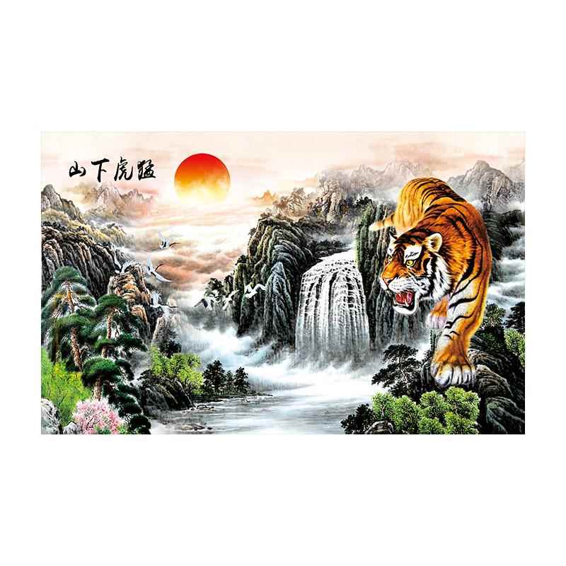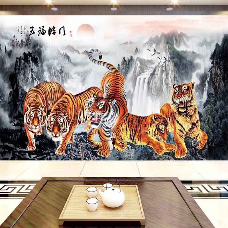 猛虎下山中式 饰墙贴8d壁画五虎图 山水3d立体电视背景墙布5d客厅装