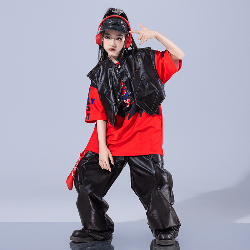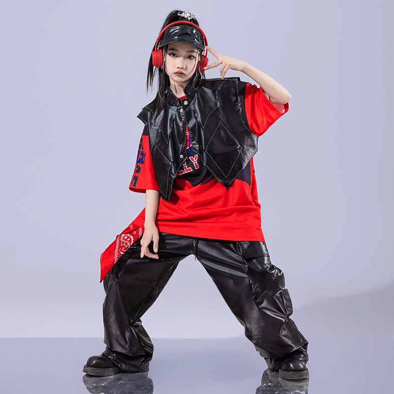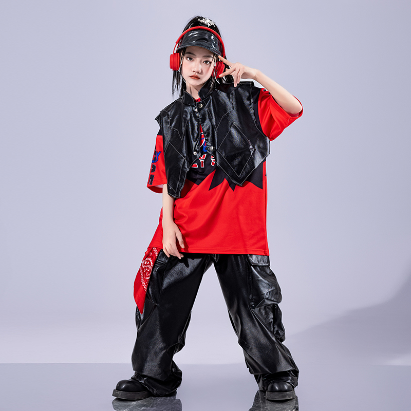 夏季 子潮牌街舞男孩表演出服酷帅套装 皮裤 少儿嘻哈潮服hiphop服装