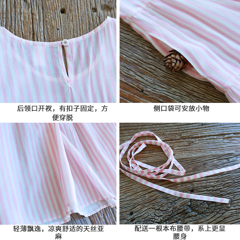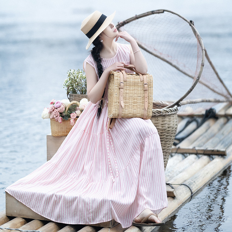 连衣裙女2025年春季 文艺条纹无袖 天丝亚麻温柔薄长裙 水清风拂
