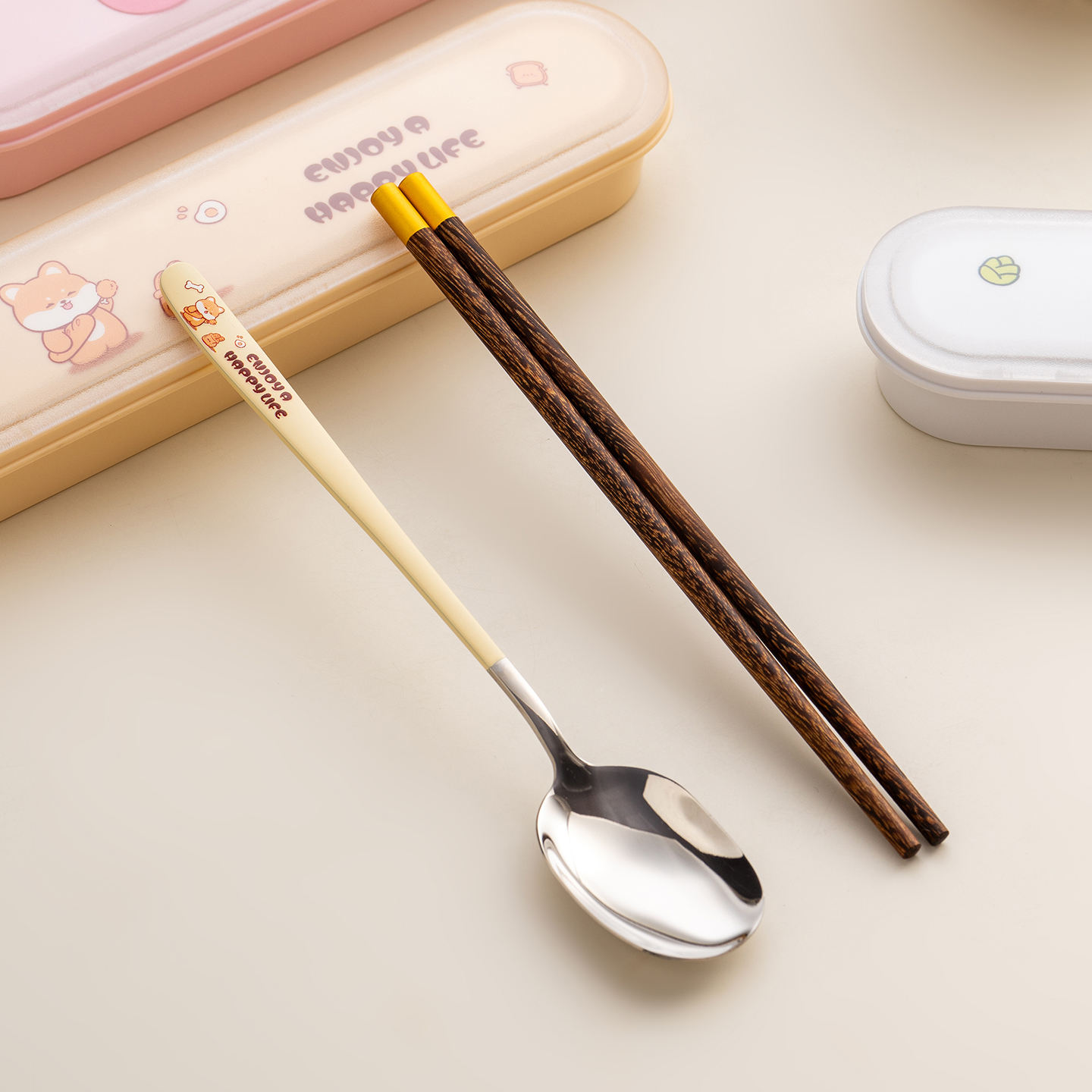 onlycook卡通便携餐具套装 316不锈钢勺鸡翅木筷子学生儿童一人用