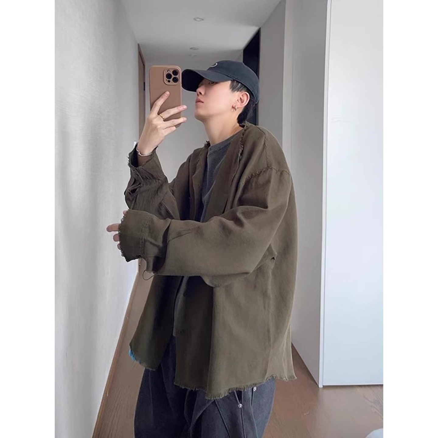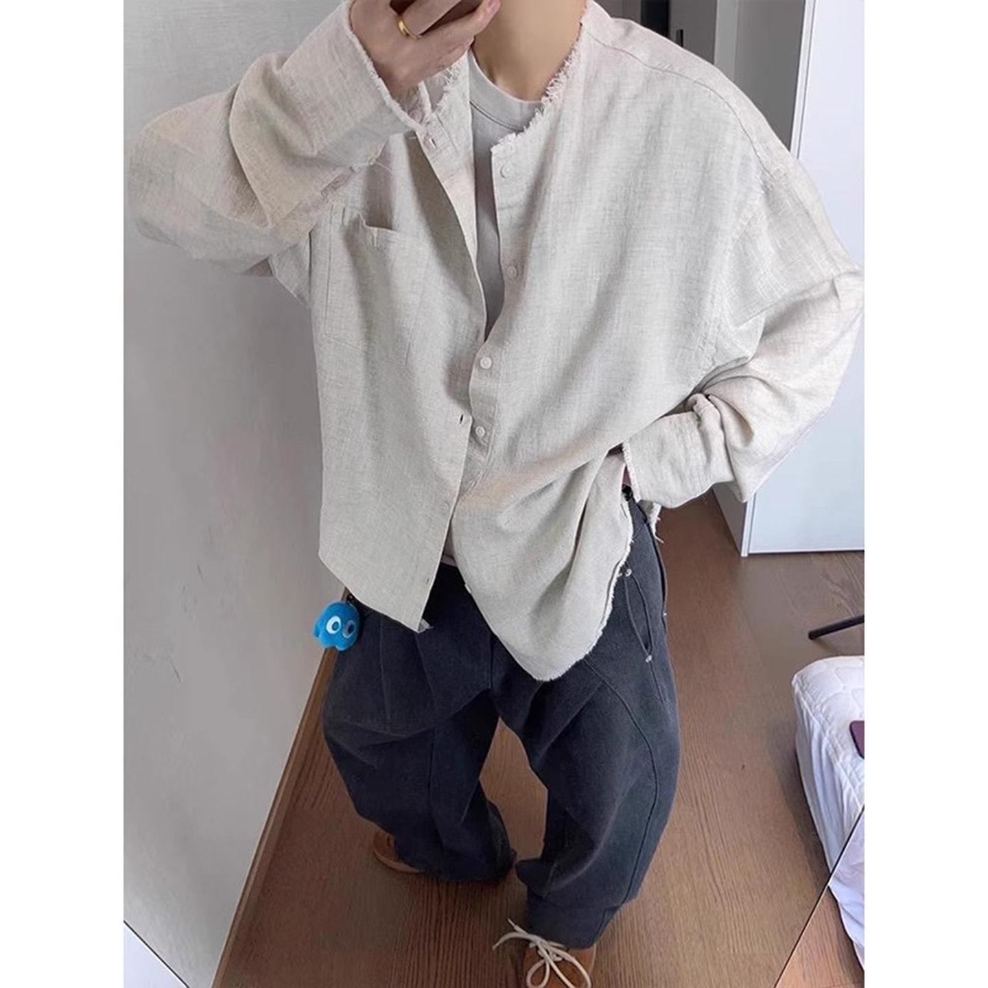 长袖 美式 薄款 男夏季 衬衣高级感痞帅防晒外套 复古毛边无领亚麻衬衫