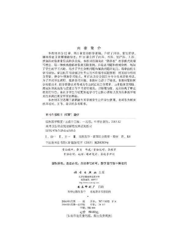 案例版 临床医学概要 王改芹编 科学出版 9787030465450书籍KX 社 京联