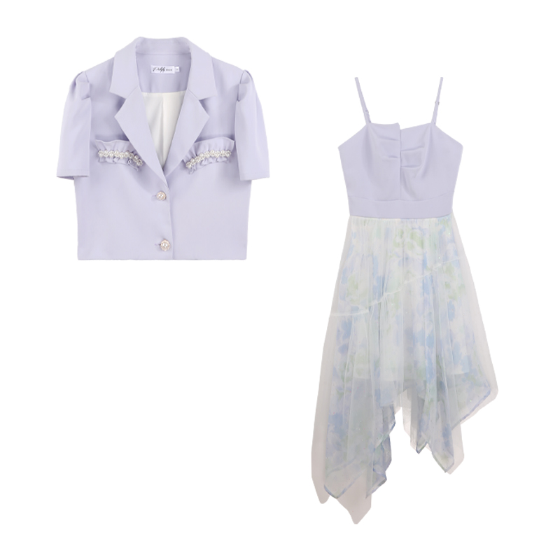 高腰不规则中长裙子女 外套印花网纱吊带连衣裙夏季 紫色短款 小西装