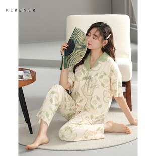 凉感纯棉睡衣女休闲开衫 家居服套装 薄款 长裤 带胸垫短袖 可人儿夏季