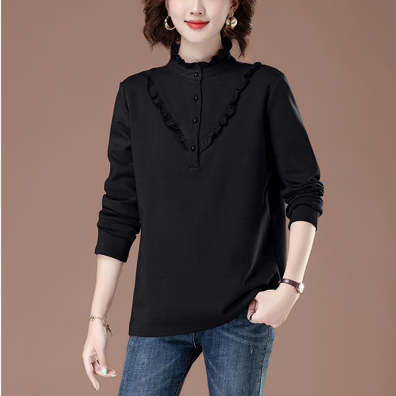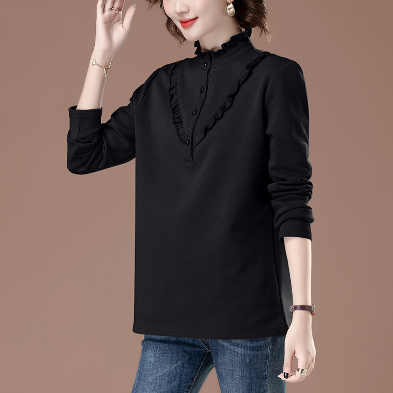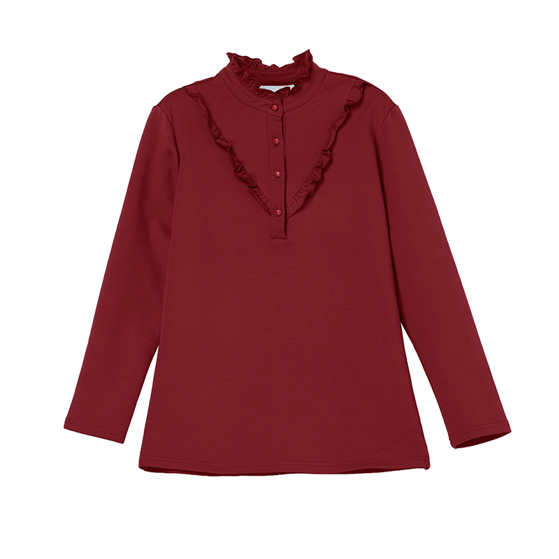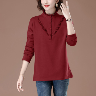 中年妈妈春装 T恤女2025新款 上衣 红色纯棉长袖 高贵气质立领打底衫