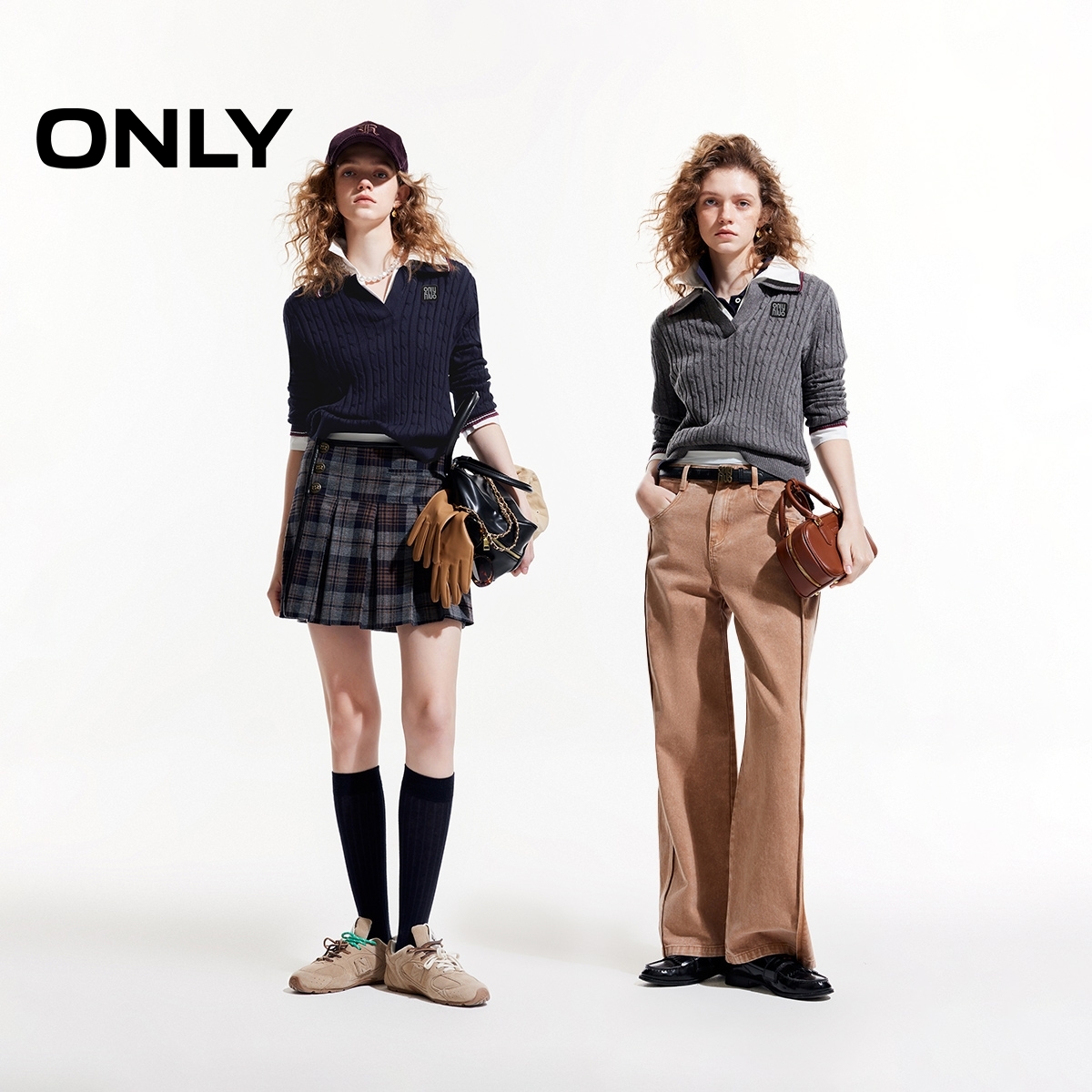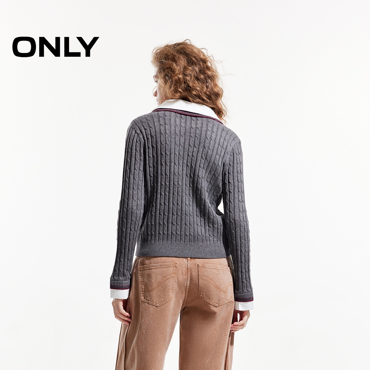 女 学院风假两件撞色拼接翻领立体麻花绞花针织衫 ONLY2025秋季 新款