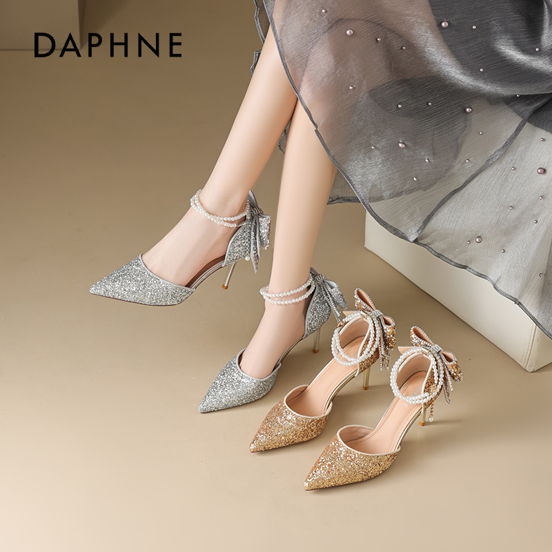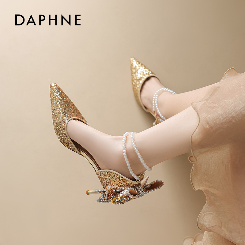 女2025新款 细跟高跟鞋 夏季 蝴蝶结法式 尖头婚鞋 达芙妮金色高跟凉鞋