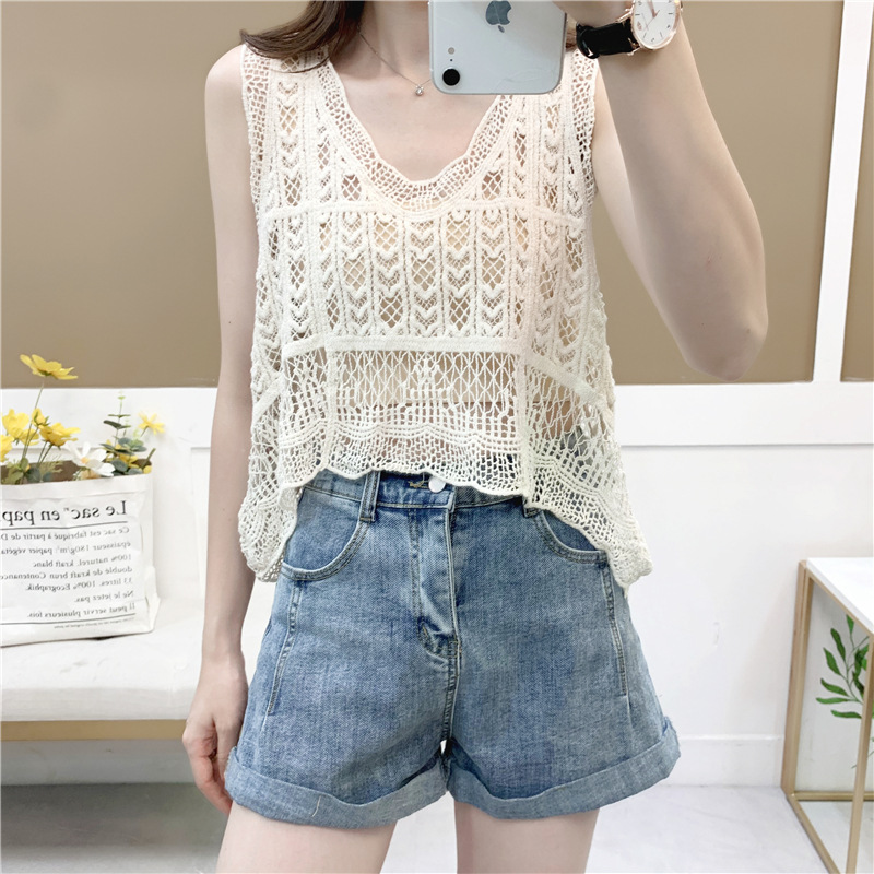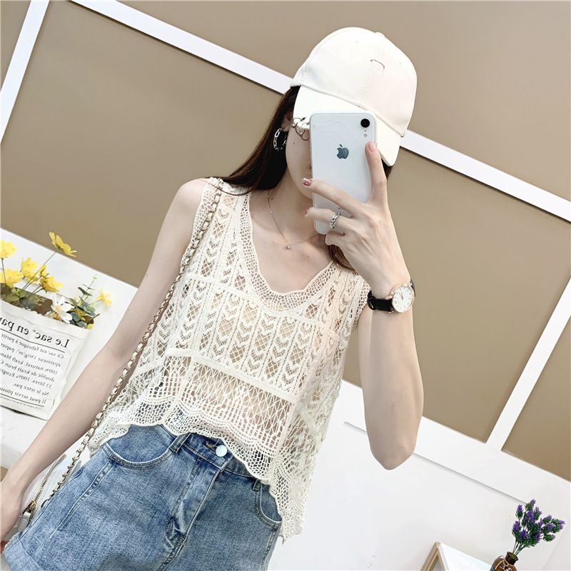 蕾丝吊带上衣 无袖 针织小马甲背心女夏外穿短款 V领勾花镂空罩衫