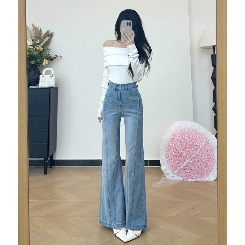 百搭弹力显瘦拖地裤 乔栈烫钻微喇牛仔裤 高腰阔腿裤 新款 女2025秋季