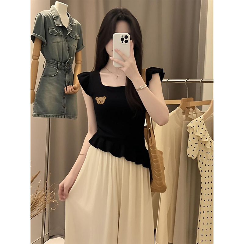 高级感显瘦不规则木耳边飞飞袖 法式 新款 T恤女夏季 上衣 黑色短袖