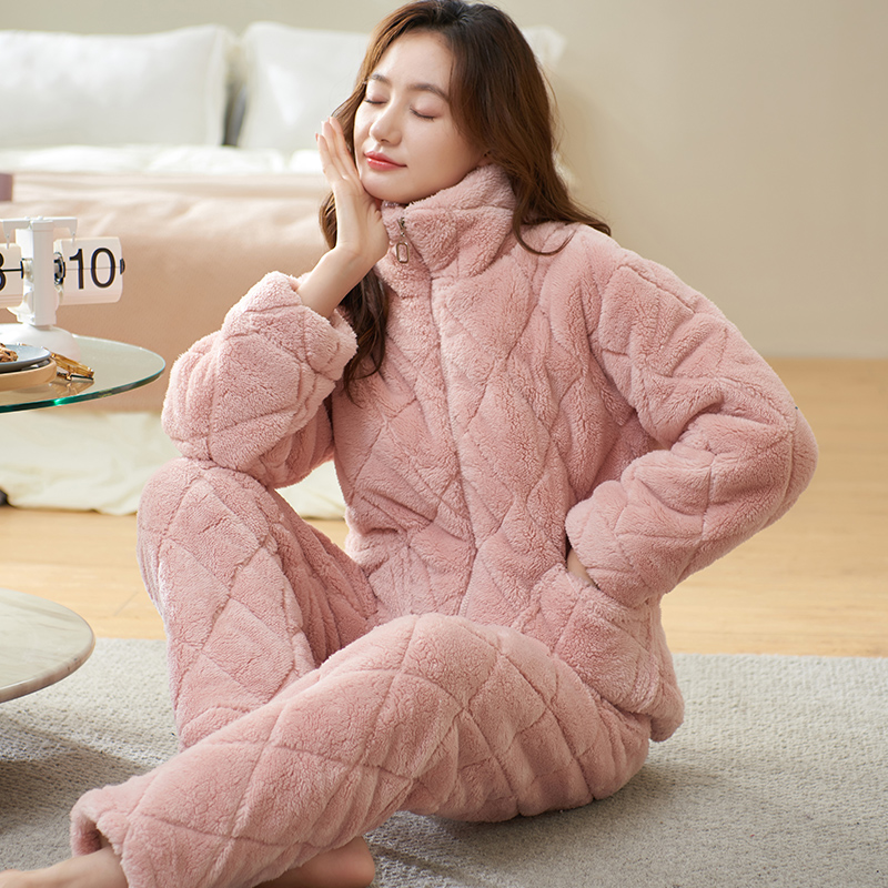 睡衣女秋冬季 珊瑚绒夹棉加厚加绒保暖法兰绒冬天可外穿棉袄家居服