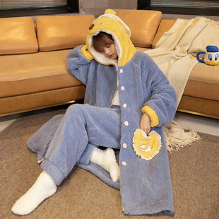 加厚珊瑚绒女士睡衣套装 秋冬加绒保暖法兰绒家居服两件套 简约长袖