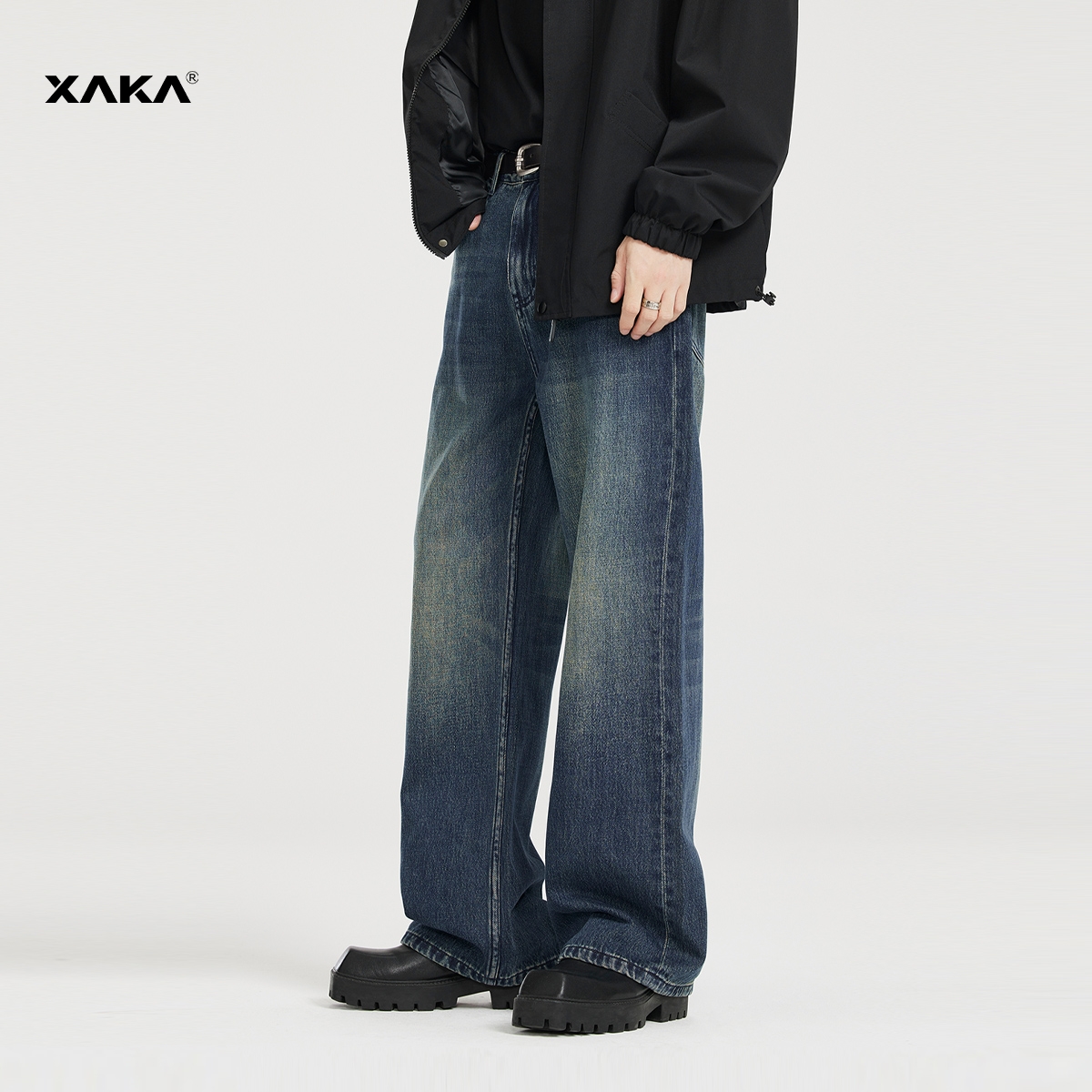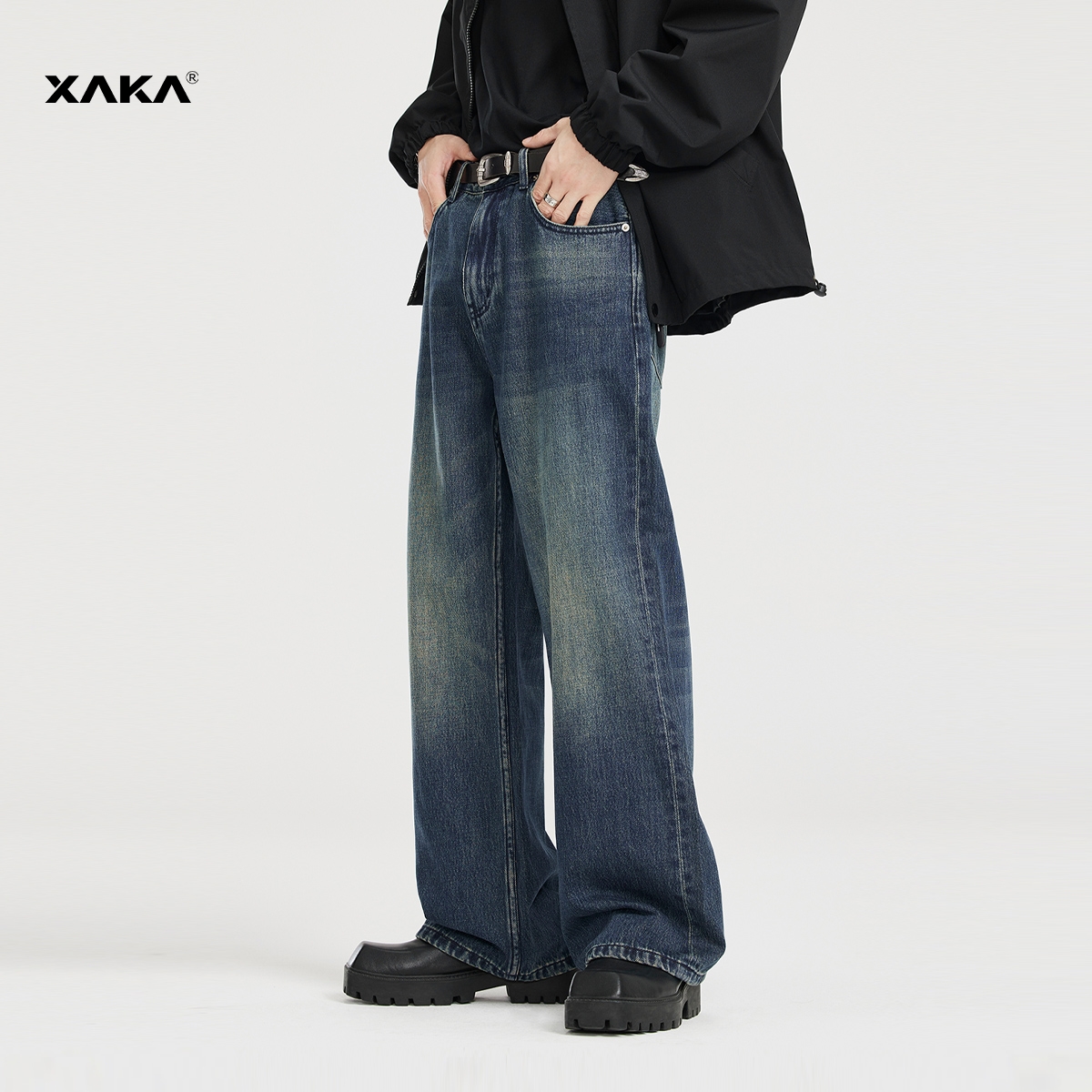 复古水洗蓝色宽松直筒阔腿长裤 XAKA微喇拖地牛仔裤 男cleanfit美式