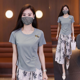 国风短袖 显瘦短款 t恤女2025新款 修身 收腰女士盘扣上衣 夏季 新中式