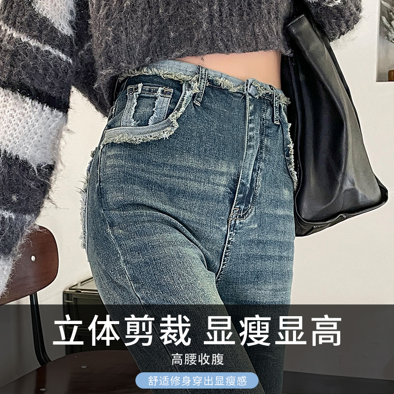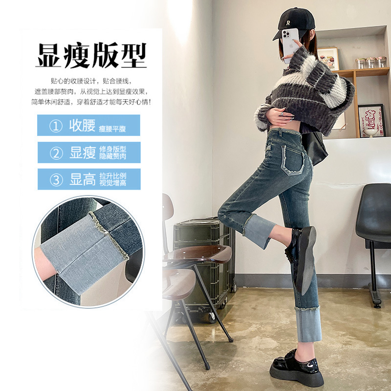 加绒ins卷边直筒牛仔裤 秋冬小个子高腰窄版 女2025新款 毛边烟管裤