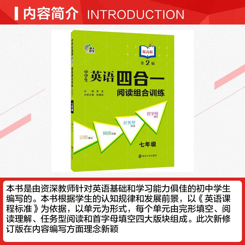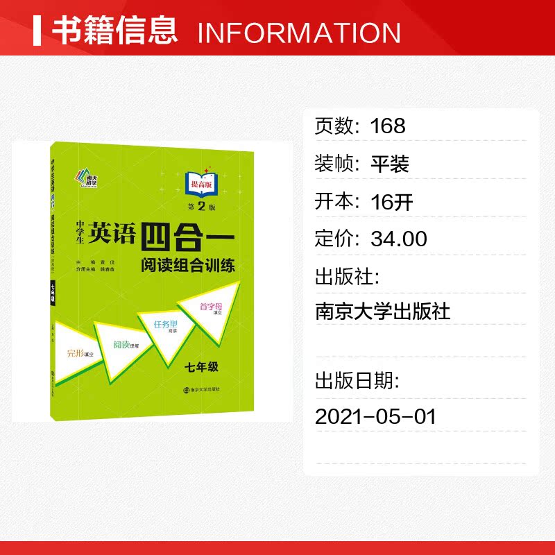 中学教辅文教 社 提高版 南京大学出版 图书籍 新华书店正版 编 黄侃 第2版 7年级 中学生英语四合一阅读组合训练