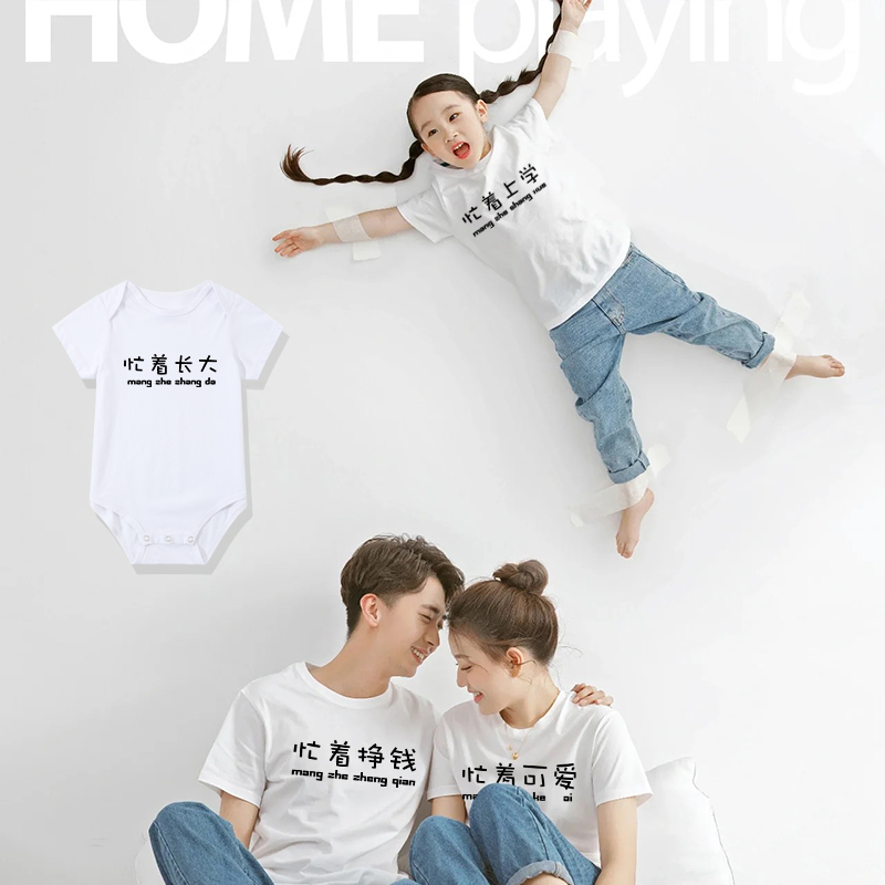 短袖 忙着挣钱可爱长大创意亲子装 一家三口四口婴儿连体包屁衣夏装
