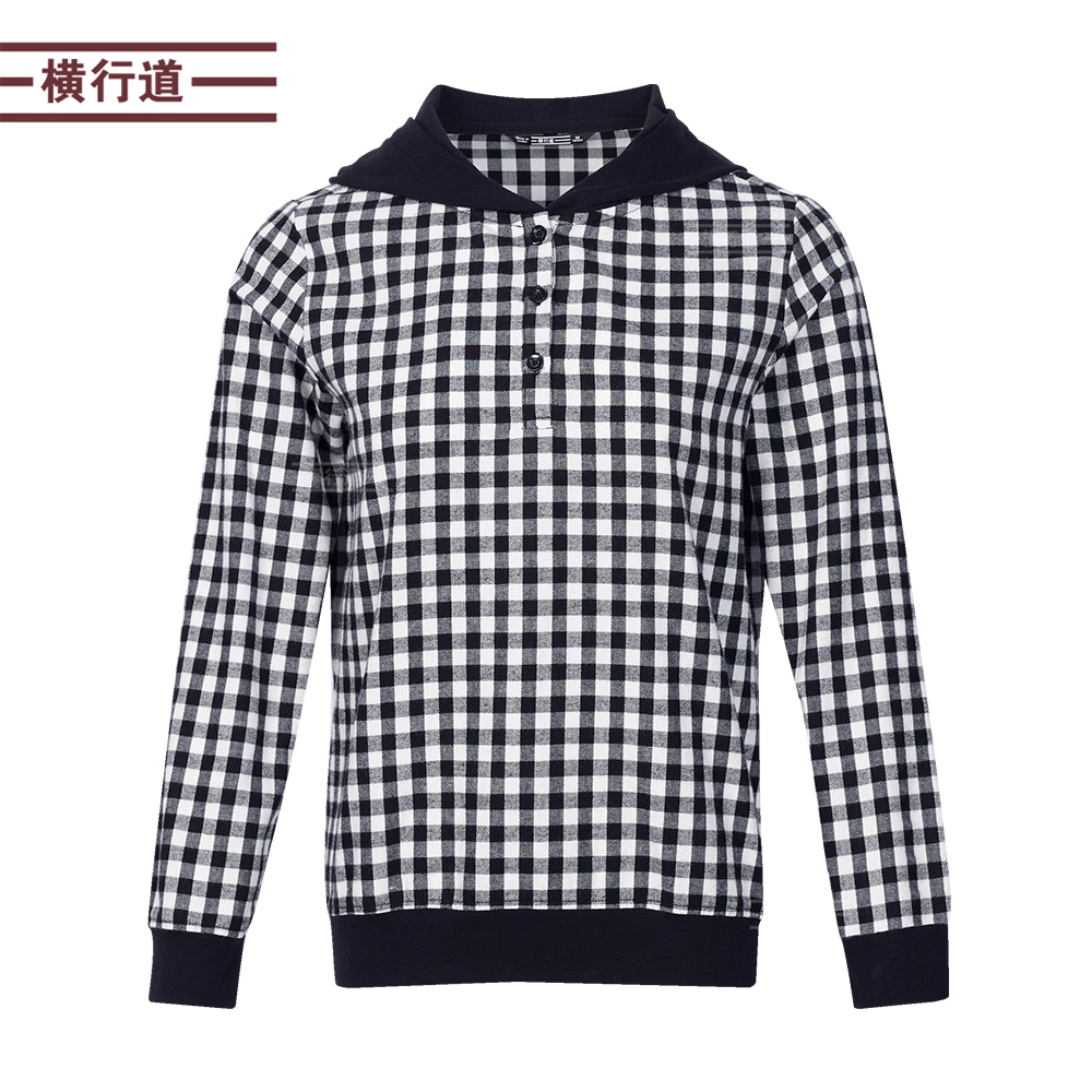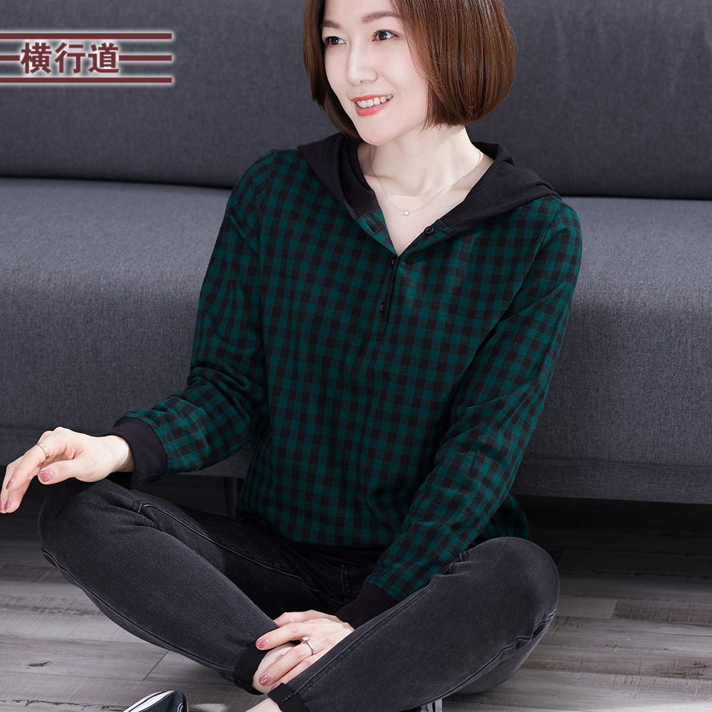韩版 秋季 T恤女装 2025胖MM妈妈长袖 宽松上衣 黑白格子连帽打底衫