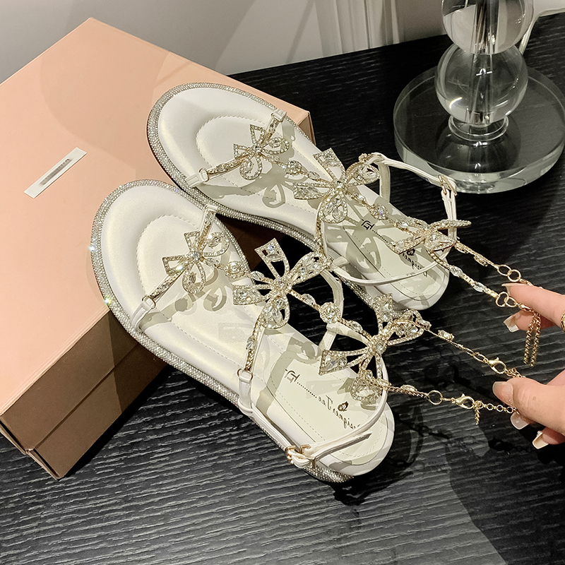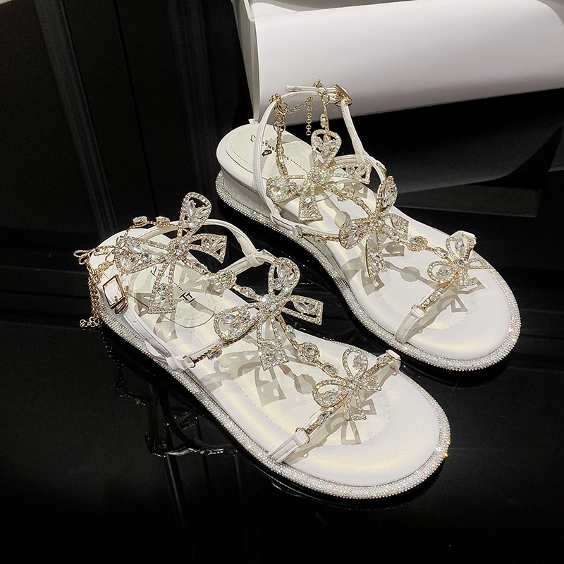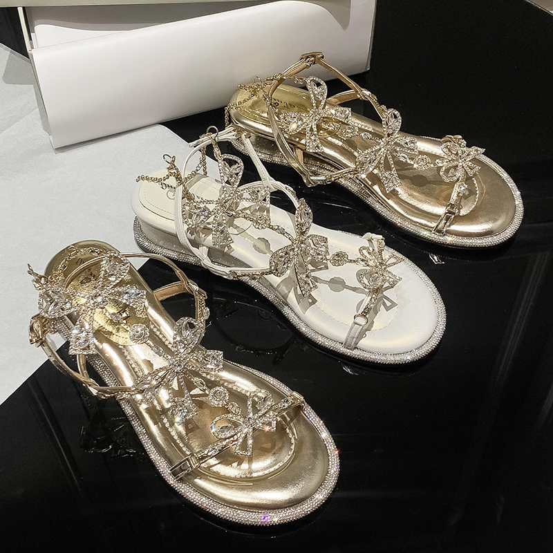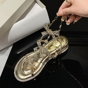 蝴蝶结水钻坡跟仙女露趾凉鞋 韩系高级感宴会配裙子高跟鞋 2024夏季
