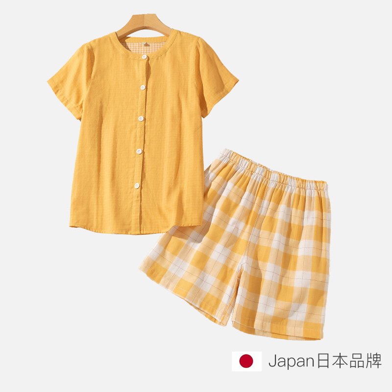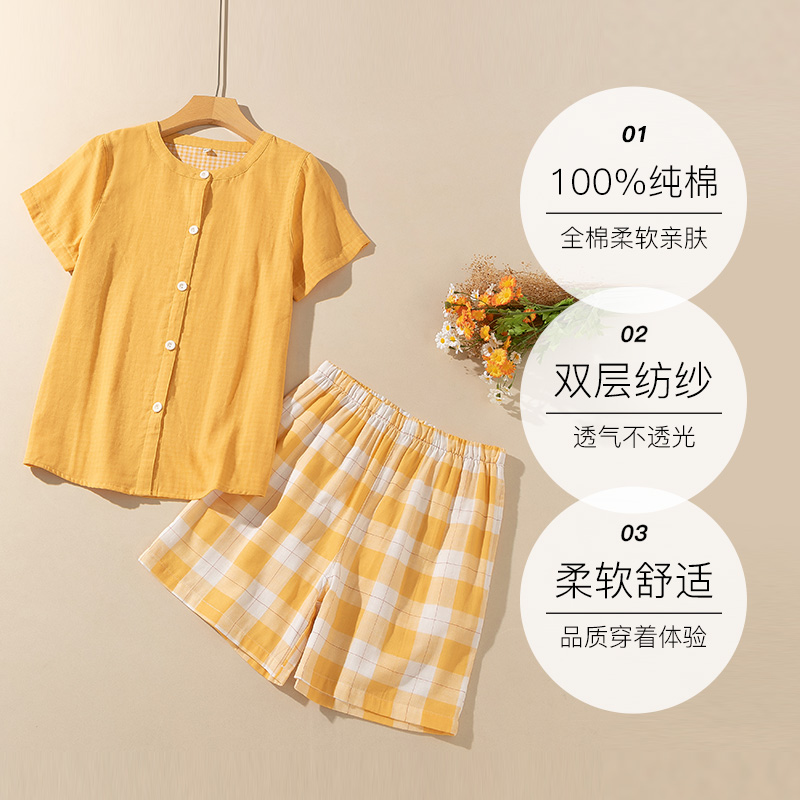 短裤 M.D.P.纯棉双层纱柔软圆领格纹短袖 女士家居服套装 自营