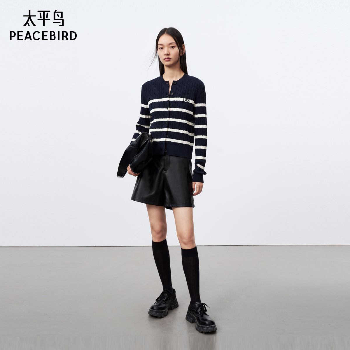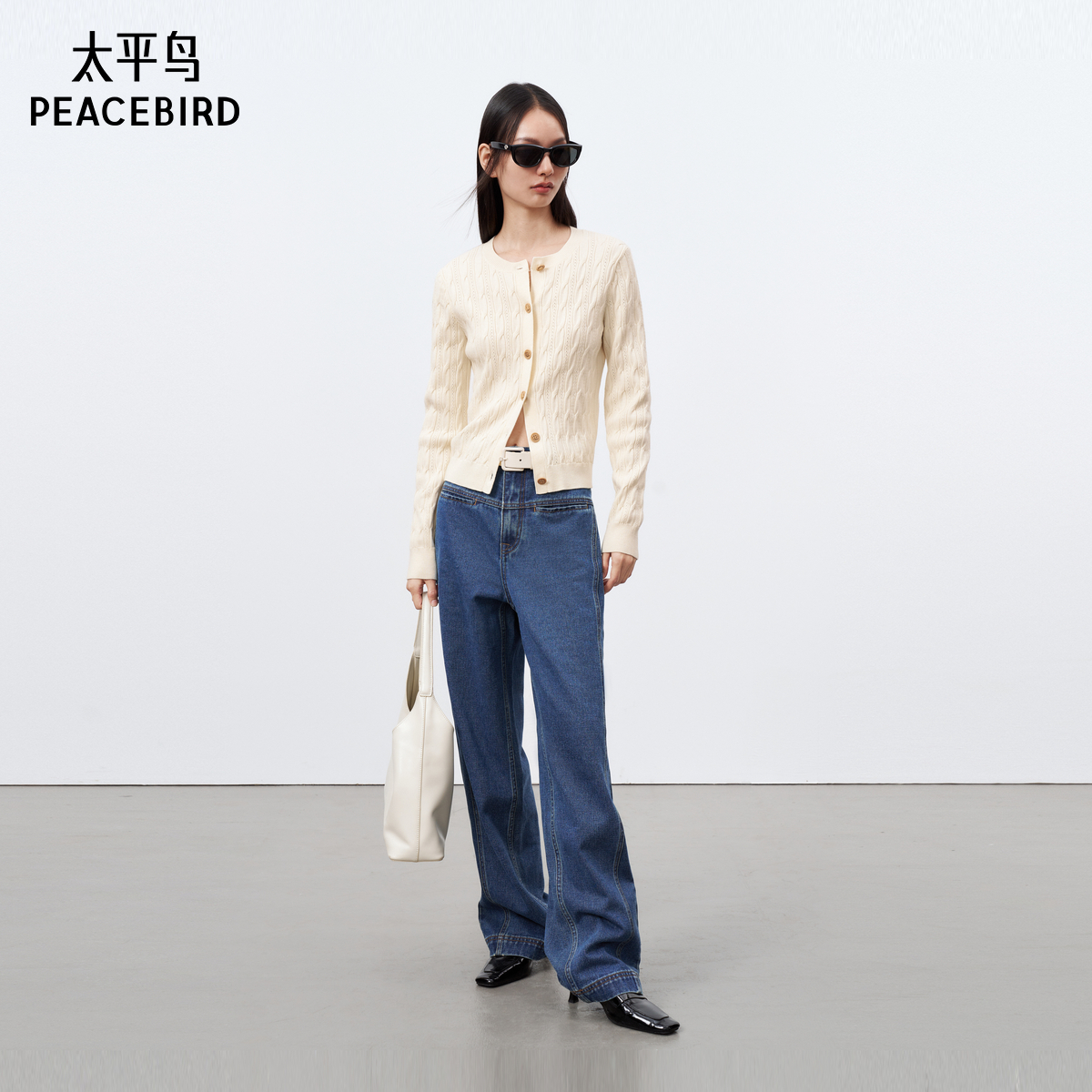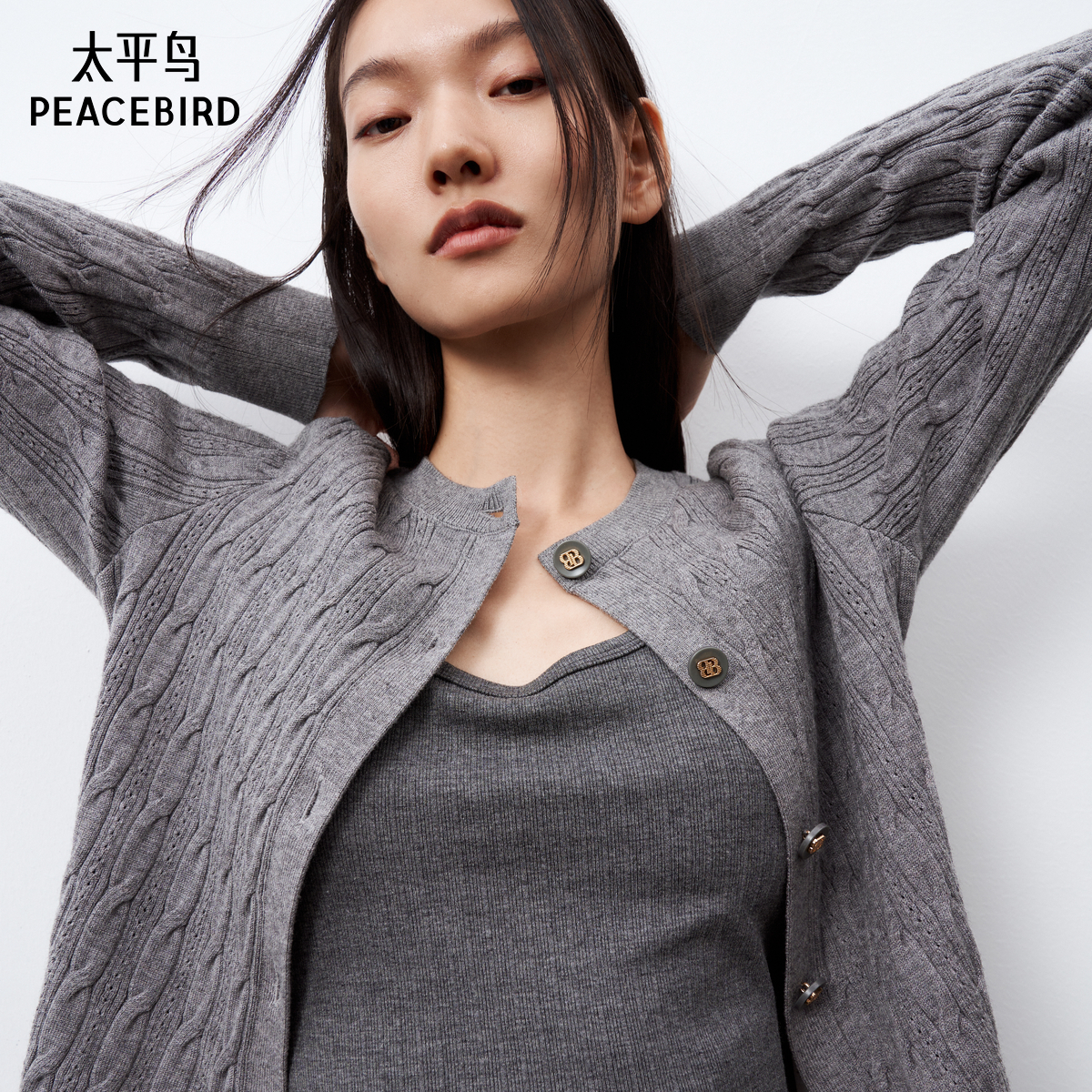 太平鸟莱赛尔羊毛绞花圆领针织开衫 老钱风针织上衣 女春装