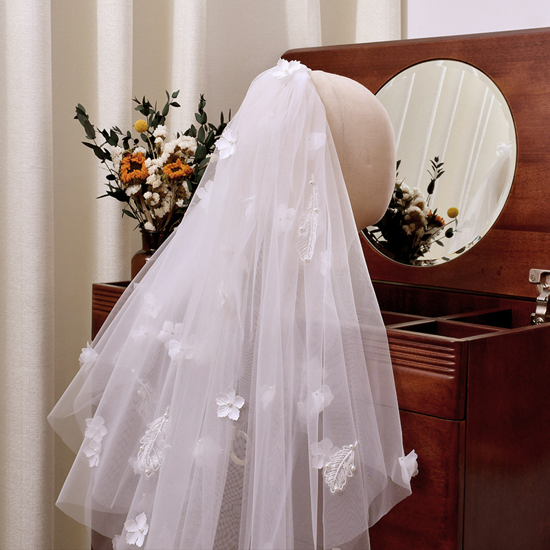 法式 白色花朵珍珠超长拖尾结婚婚礼头纱新娘主婚纱旅拍照头饰 新款