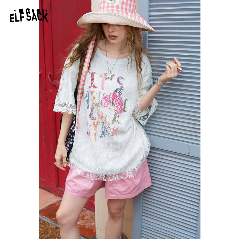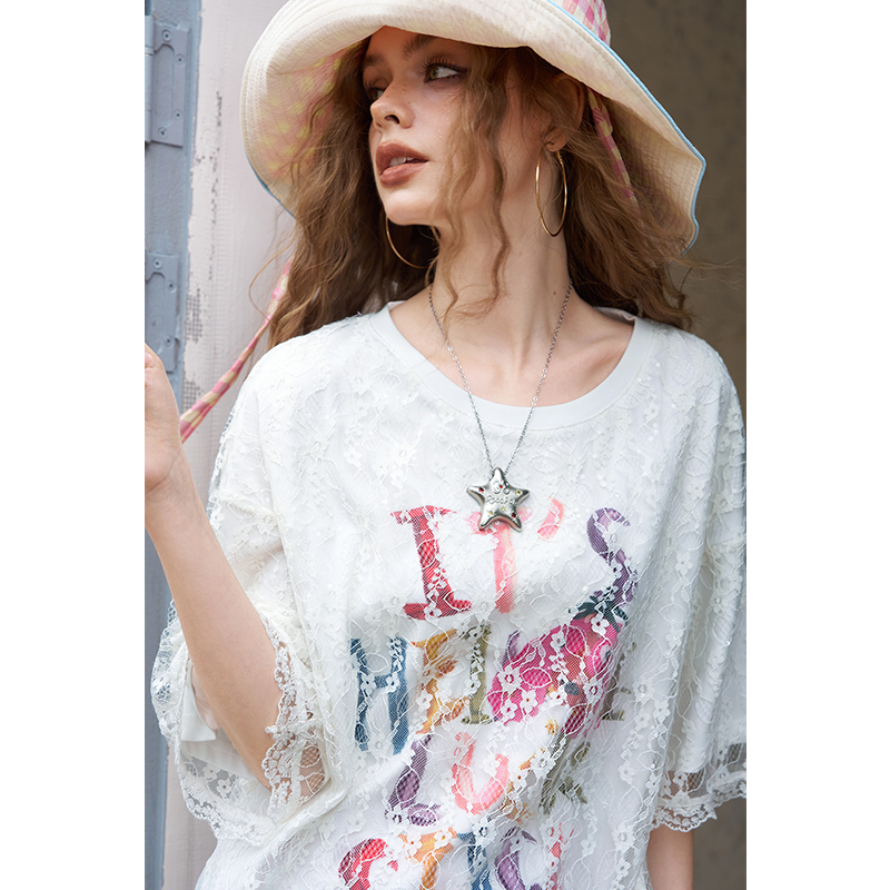 小众休闲上衣 t恤女2025年夏新款 妖精 口袋蕾丝拼接字母印花短袖