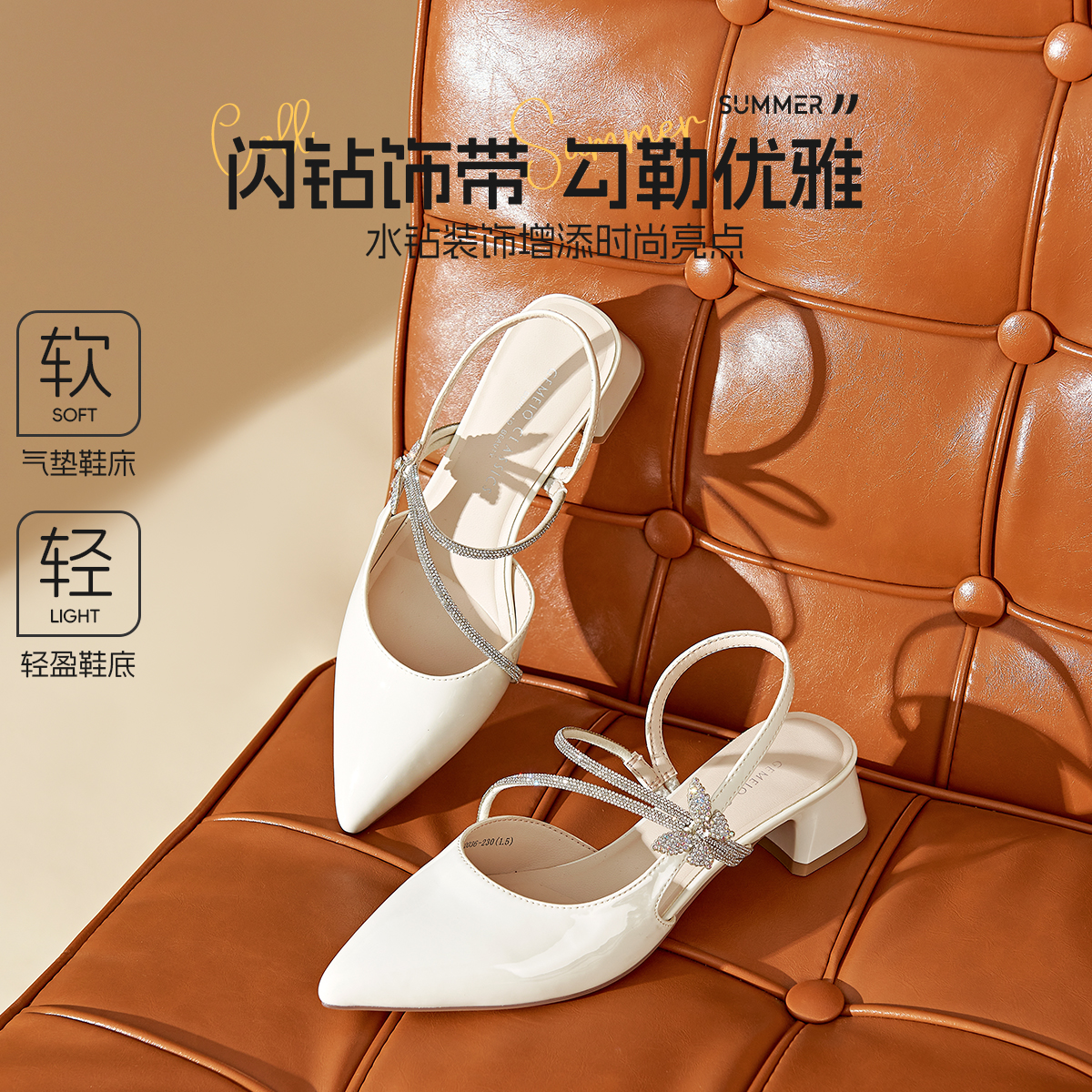 水钻蝴蝶结粗跟尖头高跟鞋 戈美其商场同款 夏季 女2025新款 包头凉鞋