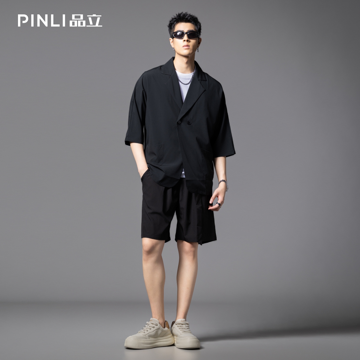 休闲套装 PINLI品立2025夏季 潮牌黑色西装 男凉感冰丝宽松短裤 新款