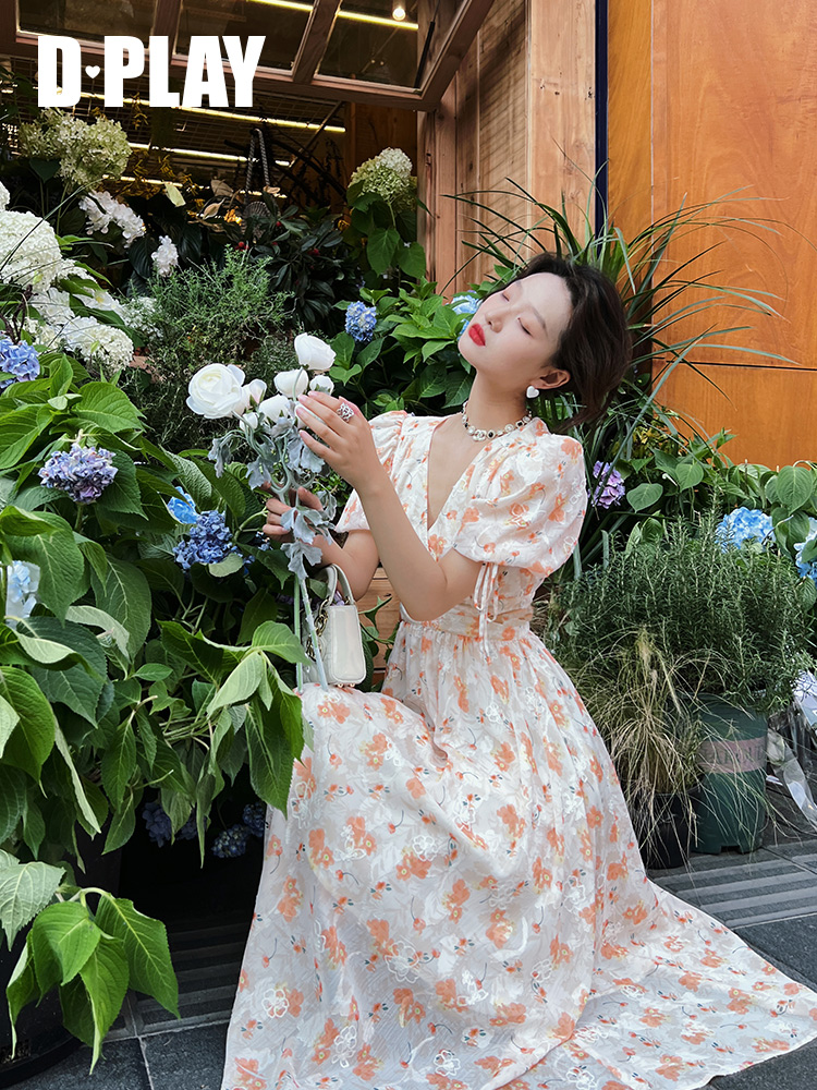 DPLAY2025年夏季 橘色连衣裙女度假印花雪纺海边沙滩裙长裙 新款