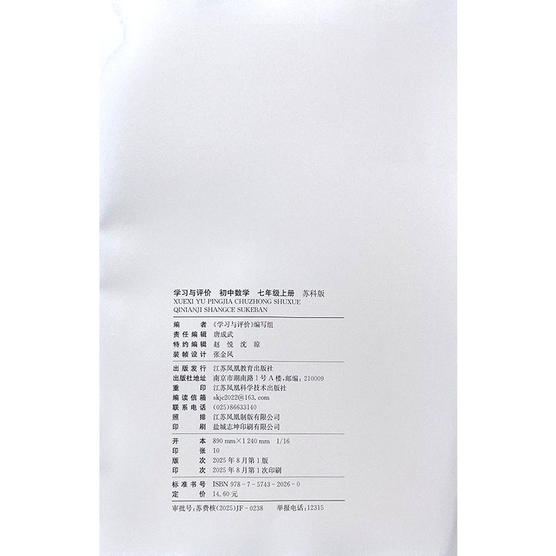 2025秋苏科版 社初一上册数学学评 学习与评价数学七年级上双色上册送电子答案7年级上册含测试卷江苏凤凰教育出版