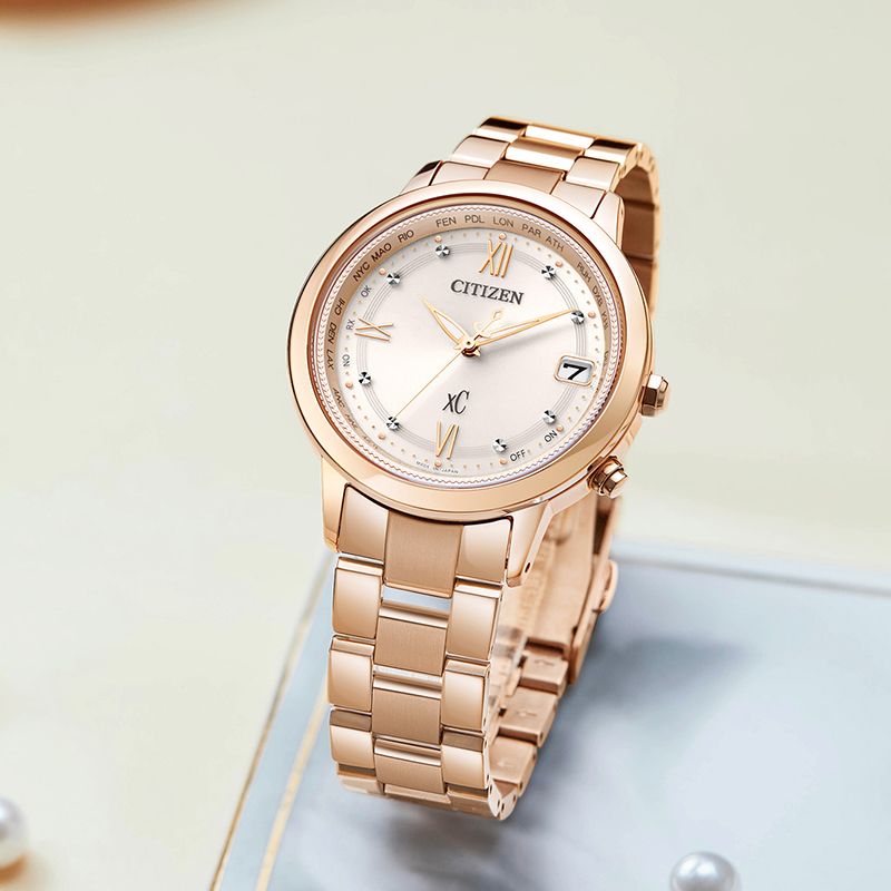 西铁城xC系列舒博钛镀金粉色光动能夜光多局电波防水女表CB1132