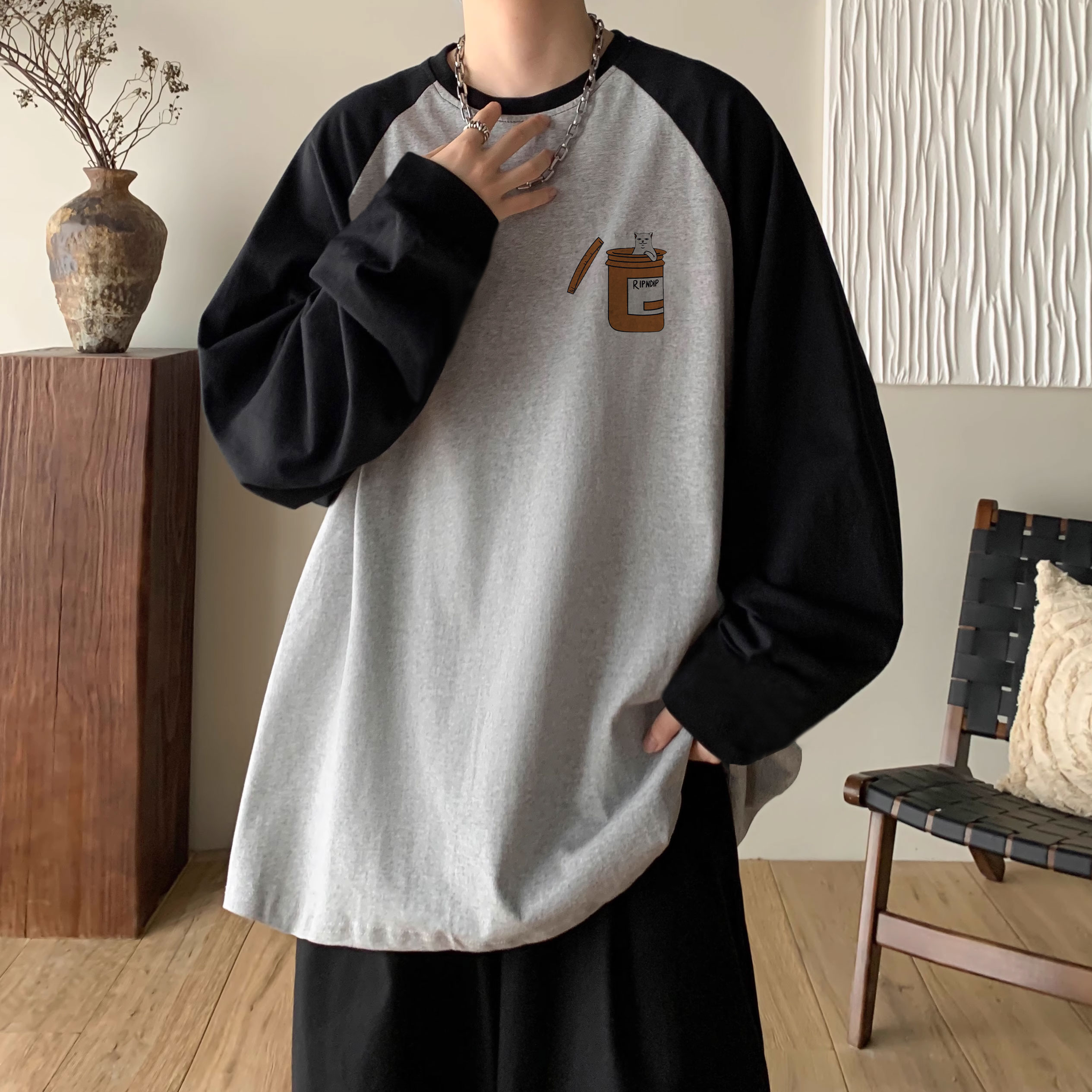 撞色插肩纯棉长袖 高街学院风宽松加绒加厚上衣 t恤男秋冬潮牌美式